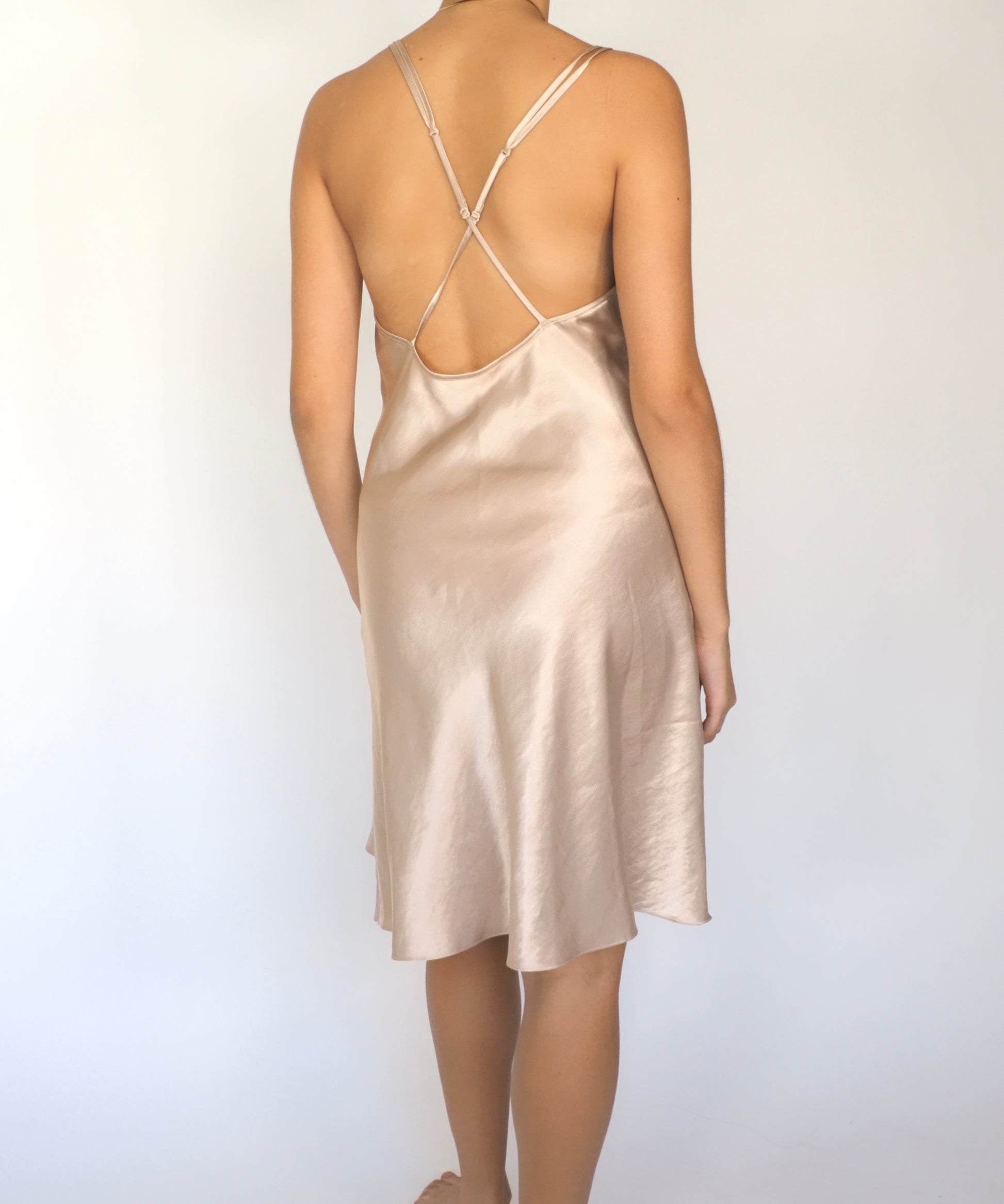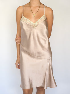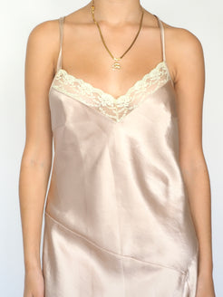 90s Champagne Satin Slip Dress with Lace Trim