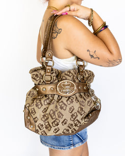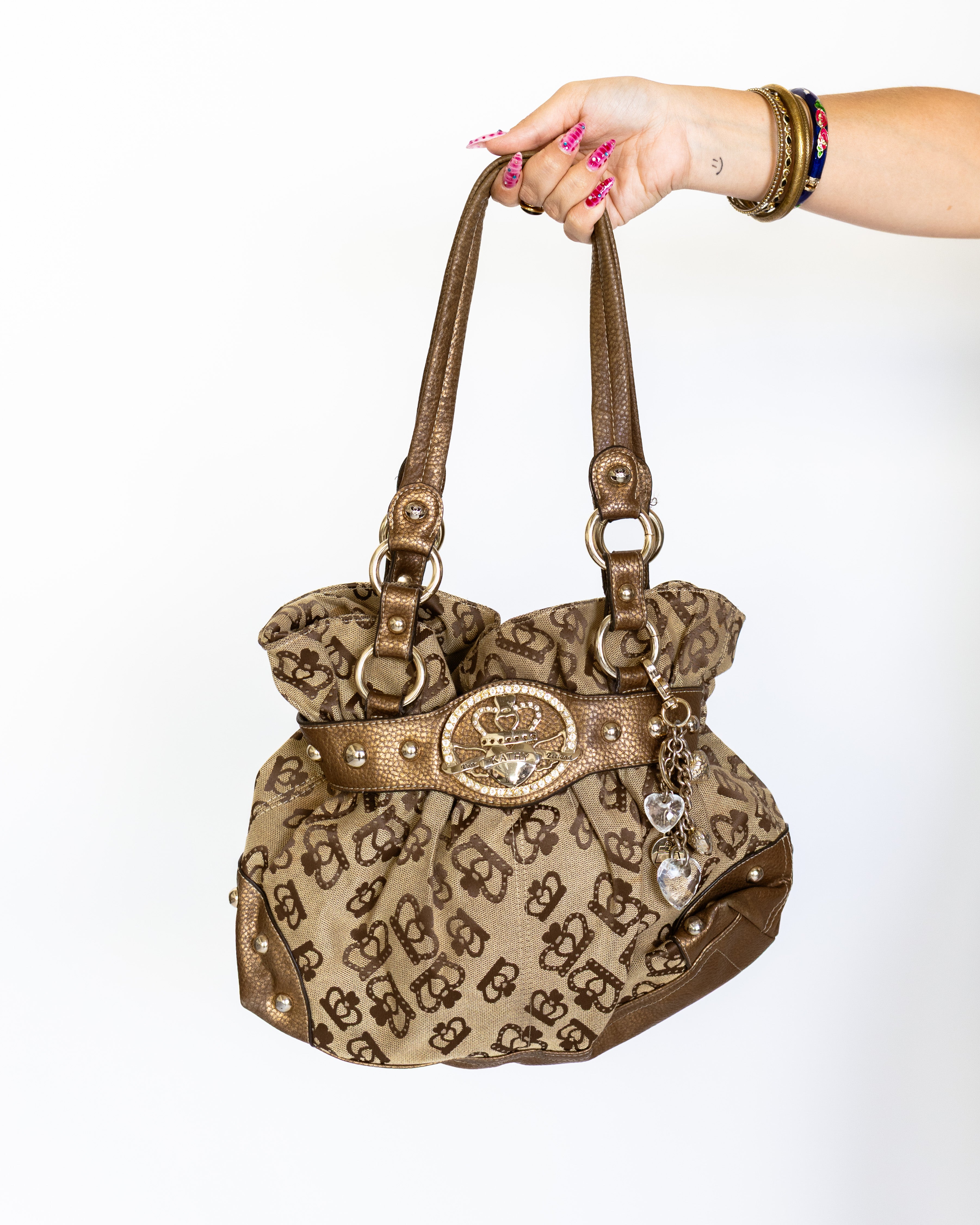 Kathy Van Zeeland’s crown logo bags were everywhere in the mid-2000s — and this one with the full monogram print is peak mall princess energy. With rhinestones, metallic trim, and a heart charm, it’s giving full-on early MTV red carpet or MySpace profile pic. Loud, proud, and unapologetically sparkly.