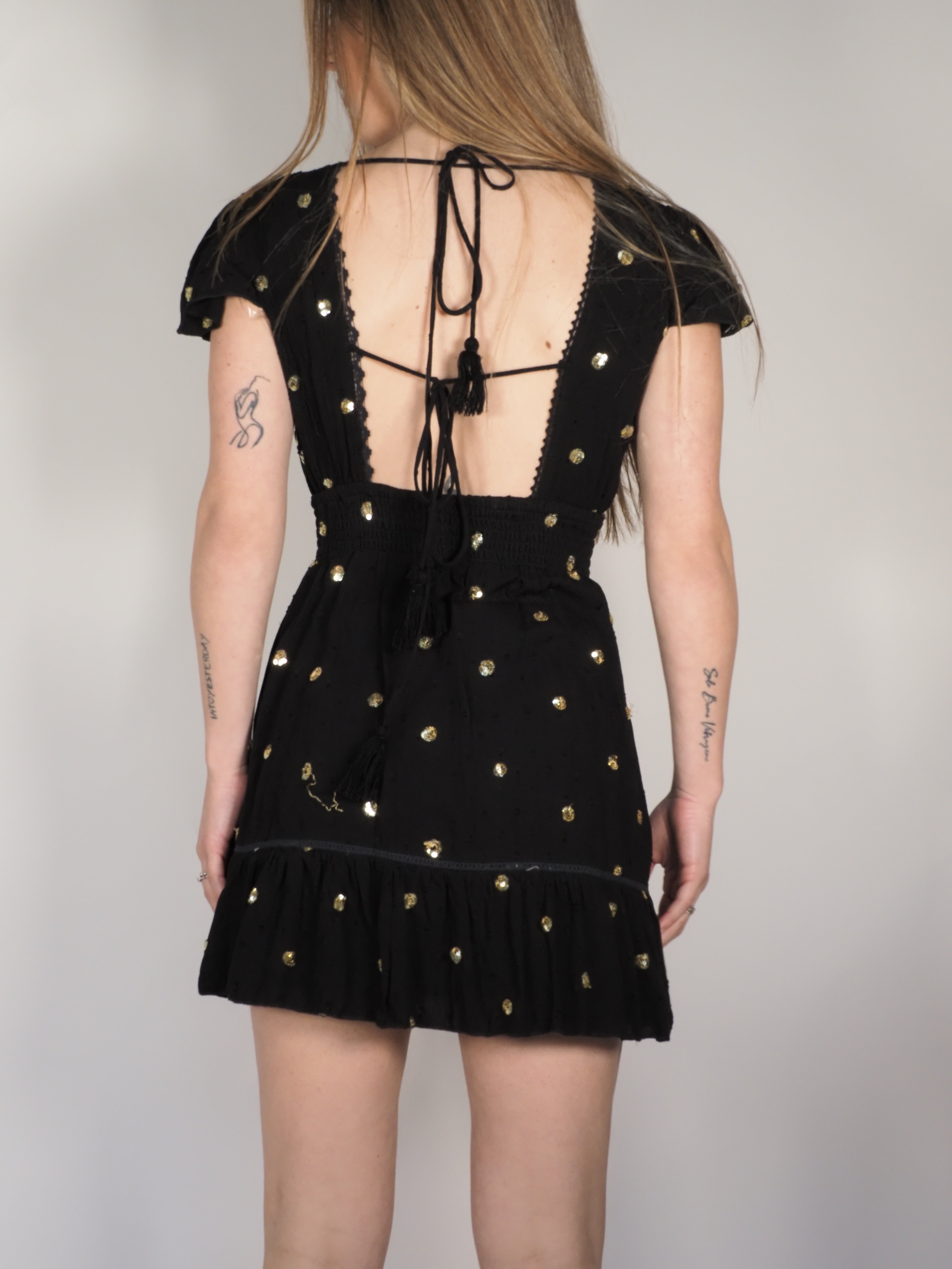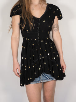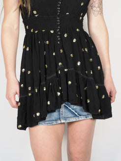 This black babydoll top features delicate gold polka detailing with a soft, floaty silhouette that cinches gently under the bust for a flattering fit. Finished with short flutter sleeves and a lightweight feel, it’s an easy throw-on piece that pairs effortlessly with denim for a chic everyday look.