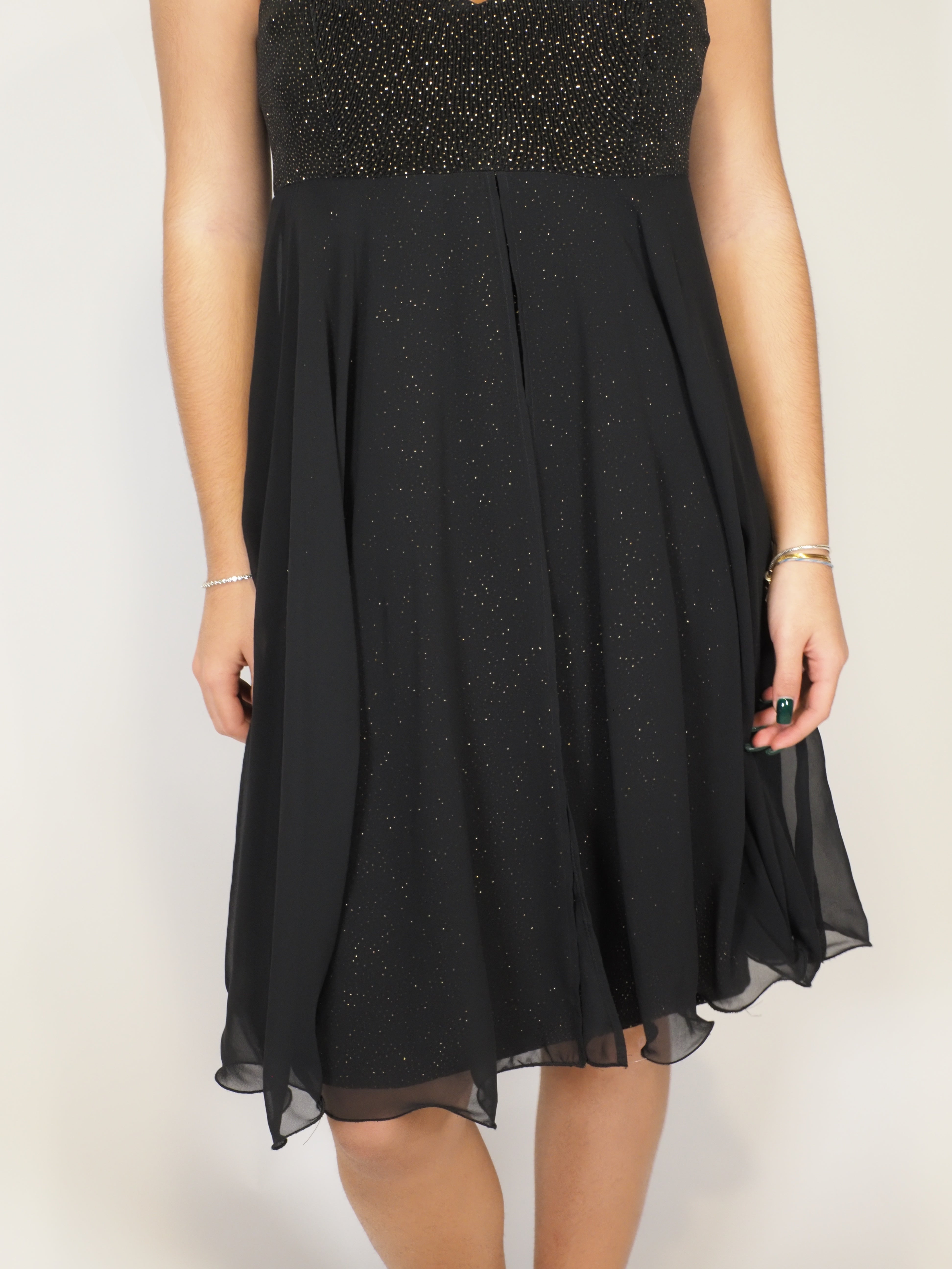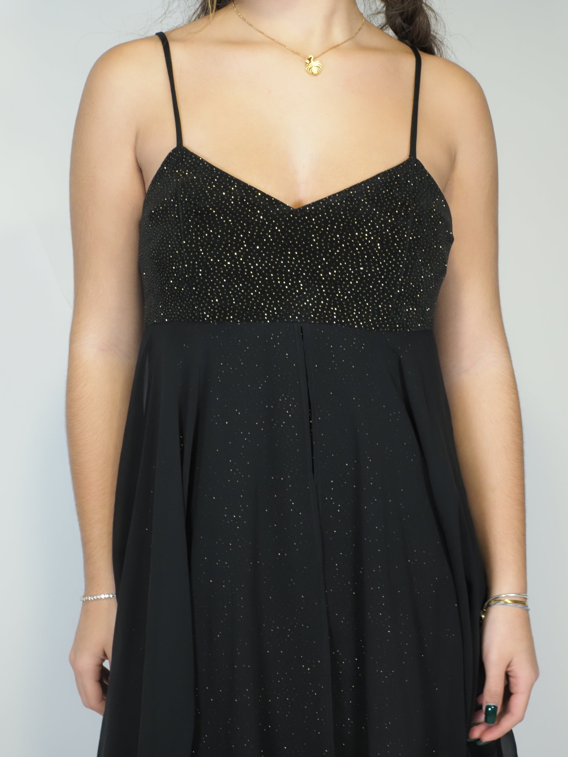 A black chiffon midi dress with a subtle sparkle woven through the fabric, giving it an elegant yet understated glow. Lightweight and flowy with delicate straps, it’s perfect for evening events, dinners, or dressed down with boots for a softer vintage look.