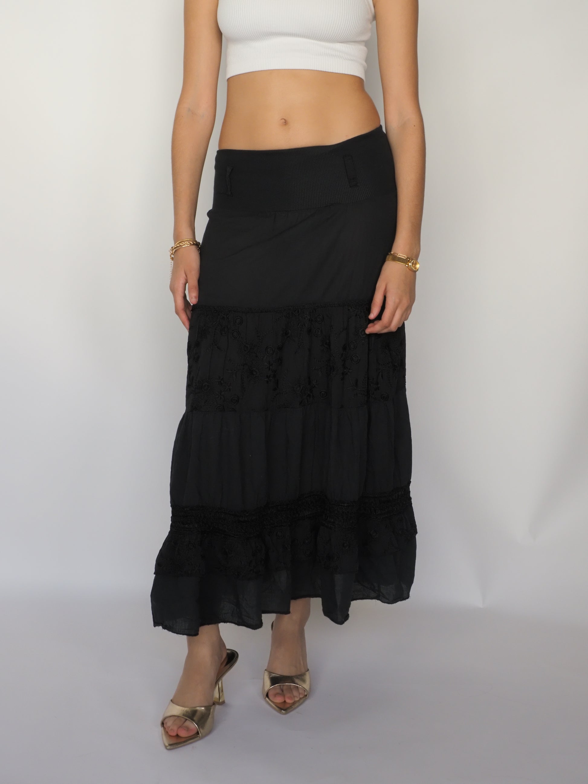 Black Tiered Boho Maxi Skirt with Crochet Detail