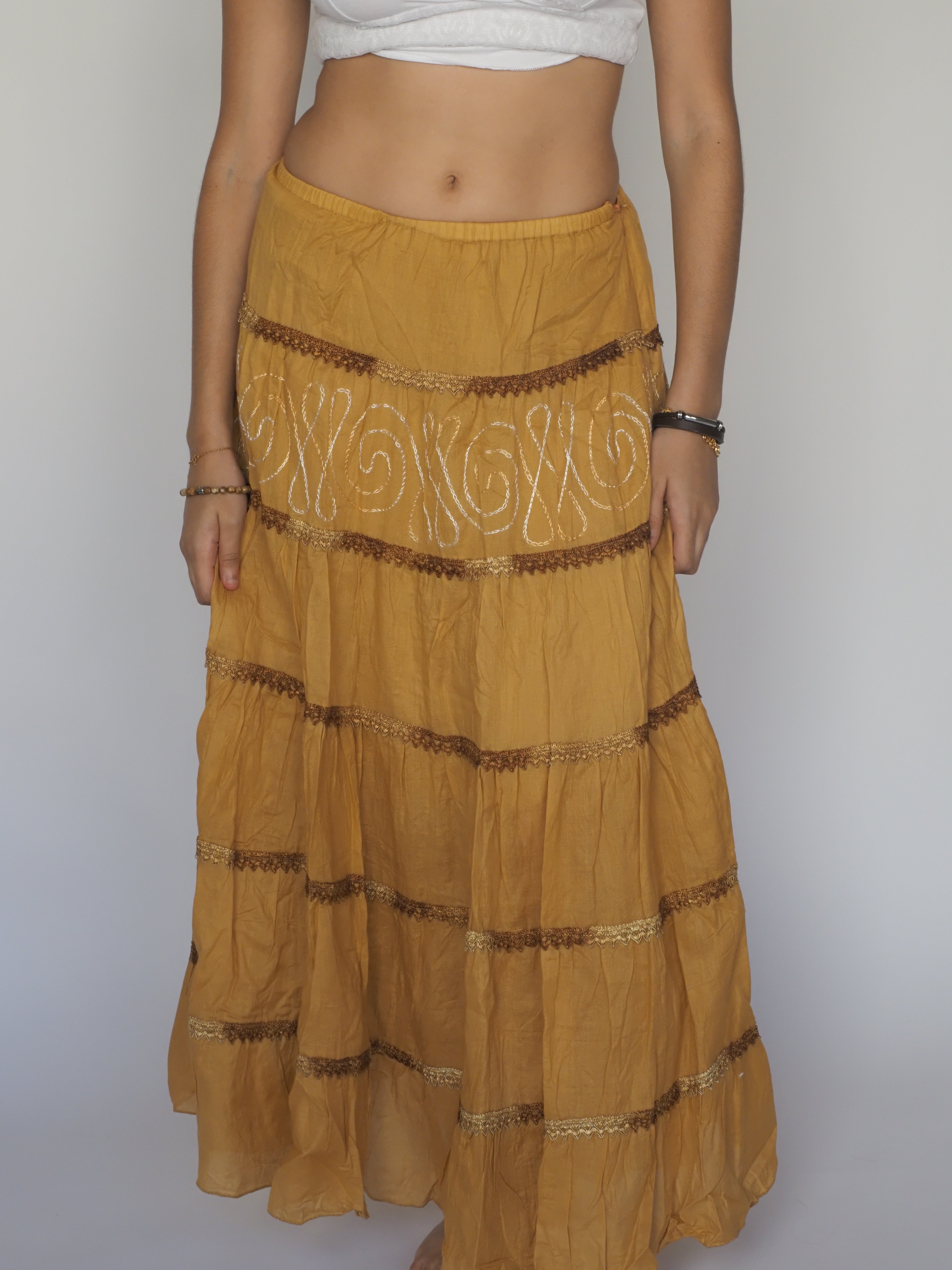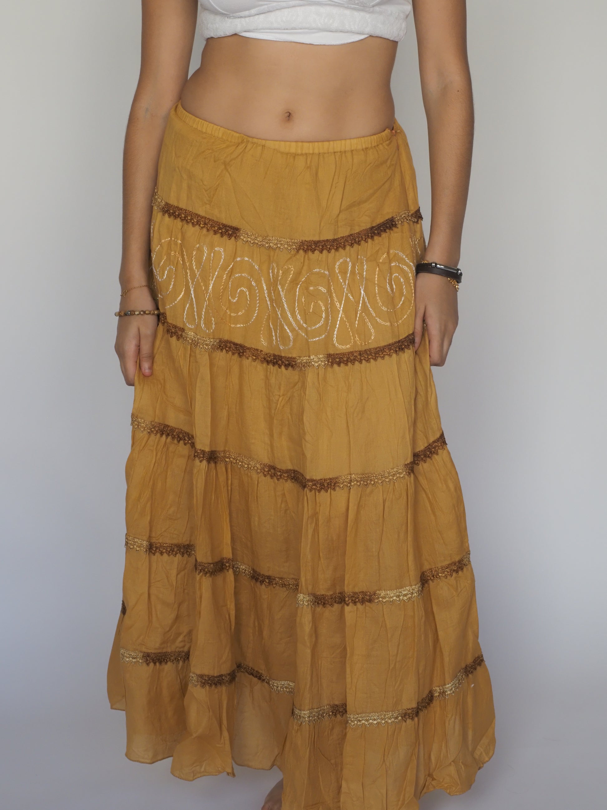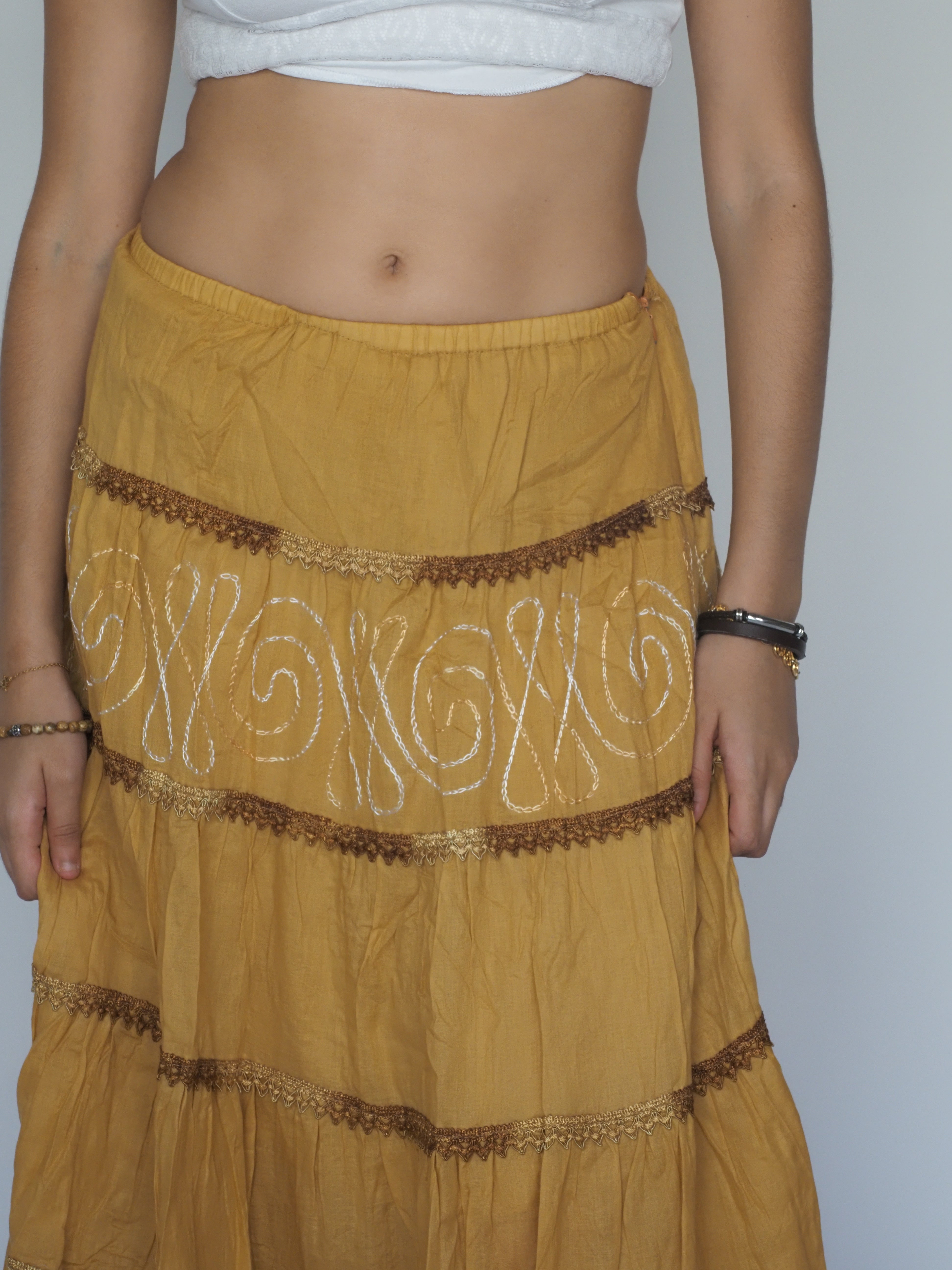 Boho Mustard Tiered Maxi Skirt with Embroidery & Lace