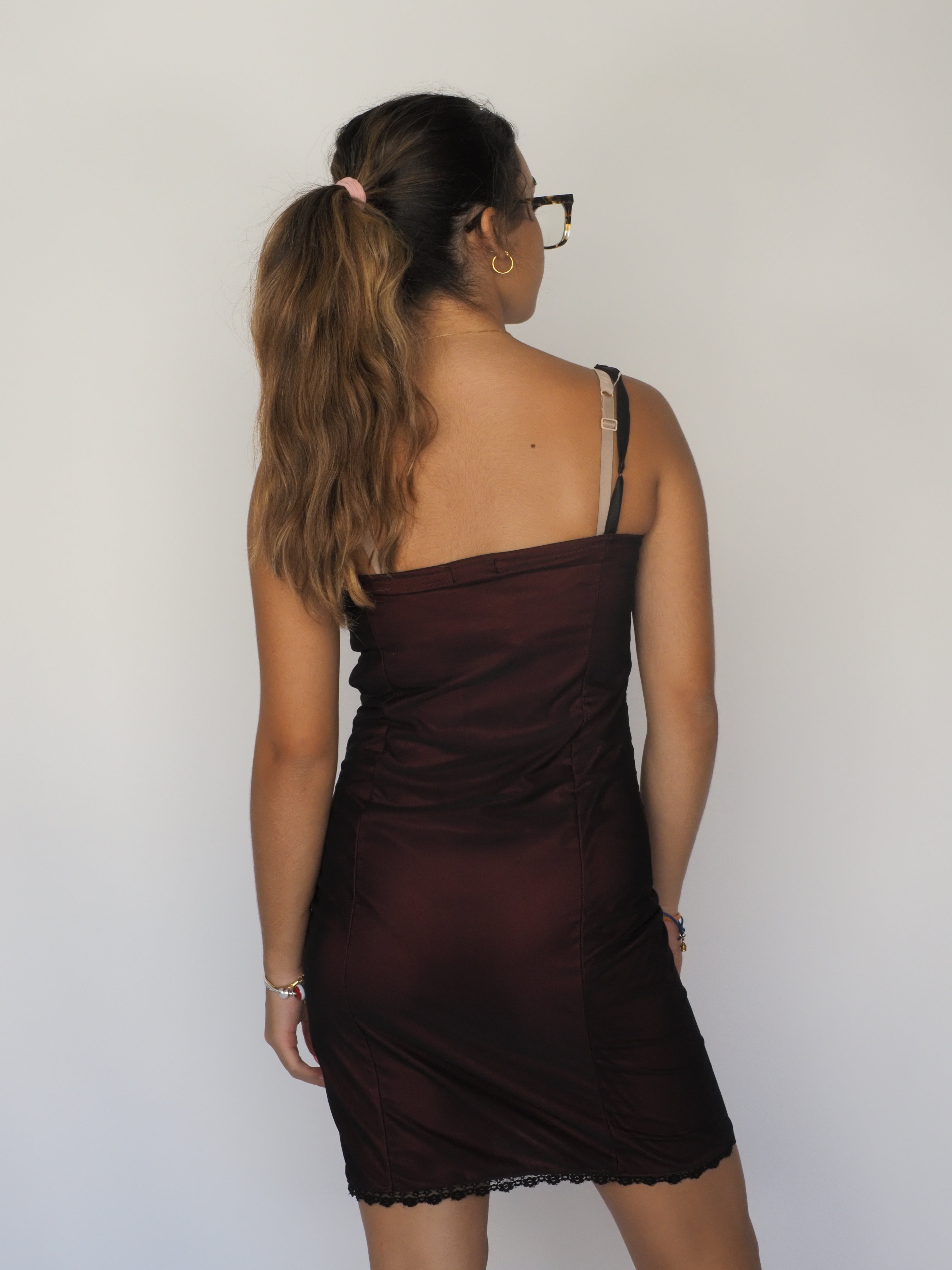 Burgundy Satin Bodycon Slip Dress with Lace Trim – Naf Naf