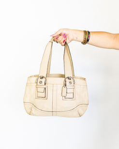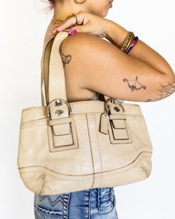 Understated, clean, and practical — this Coach tote is crafted from genuine pebble leather in a creamy beige tone, with a structured silhouette and wide double handles for comfort. The minimalist design is elevated by silver-tone hardware and stitched panel detailing, making it a timeless piece that works with any outfit.
