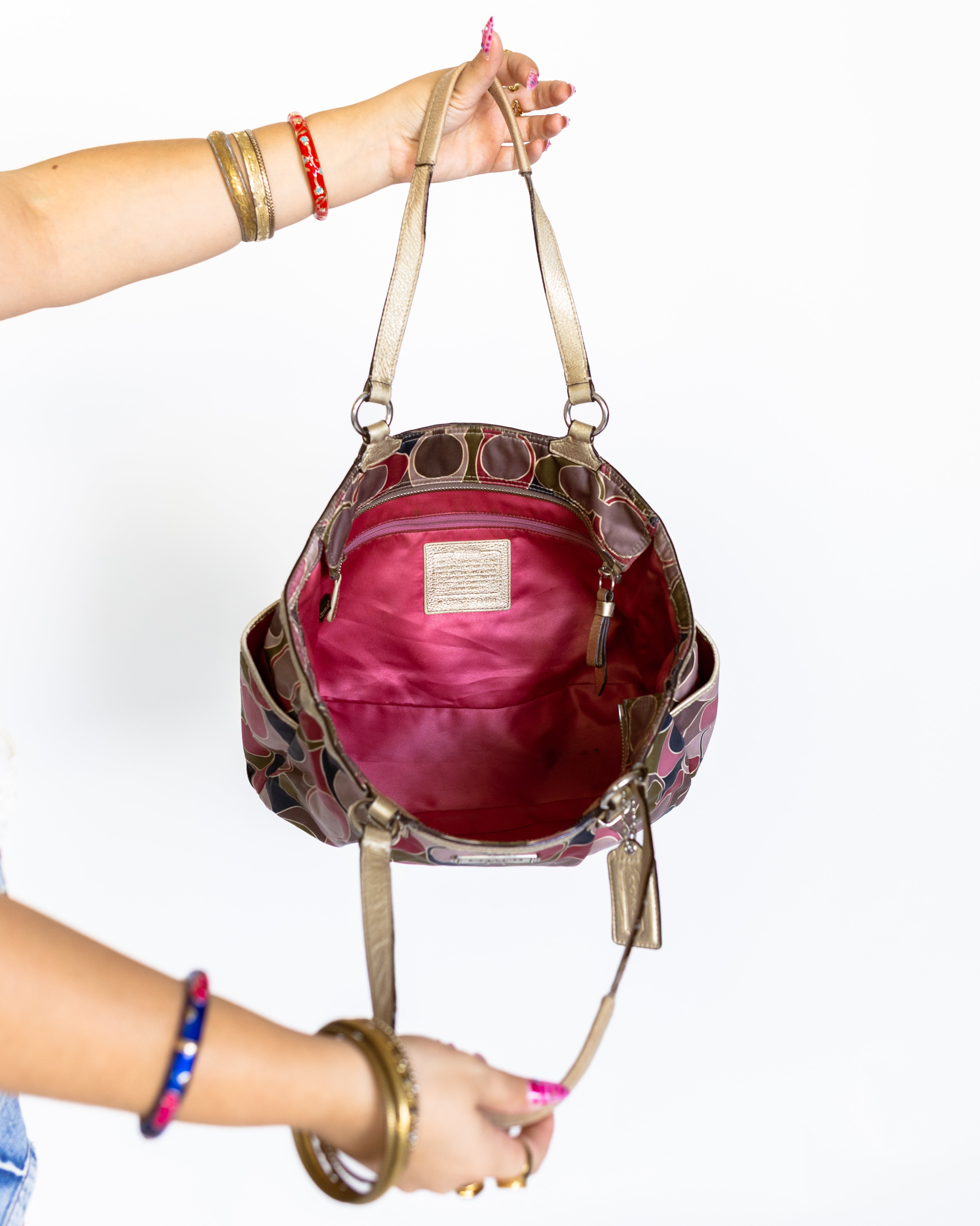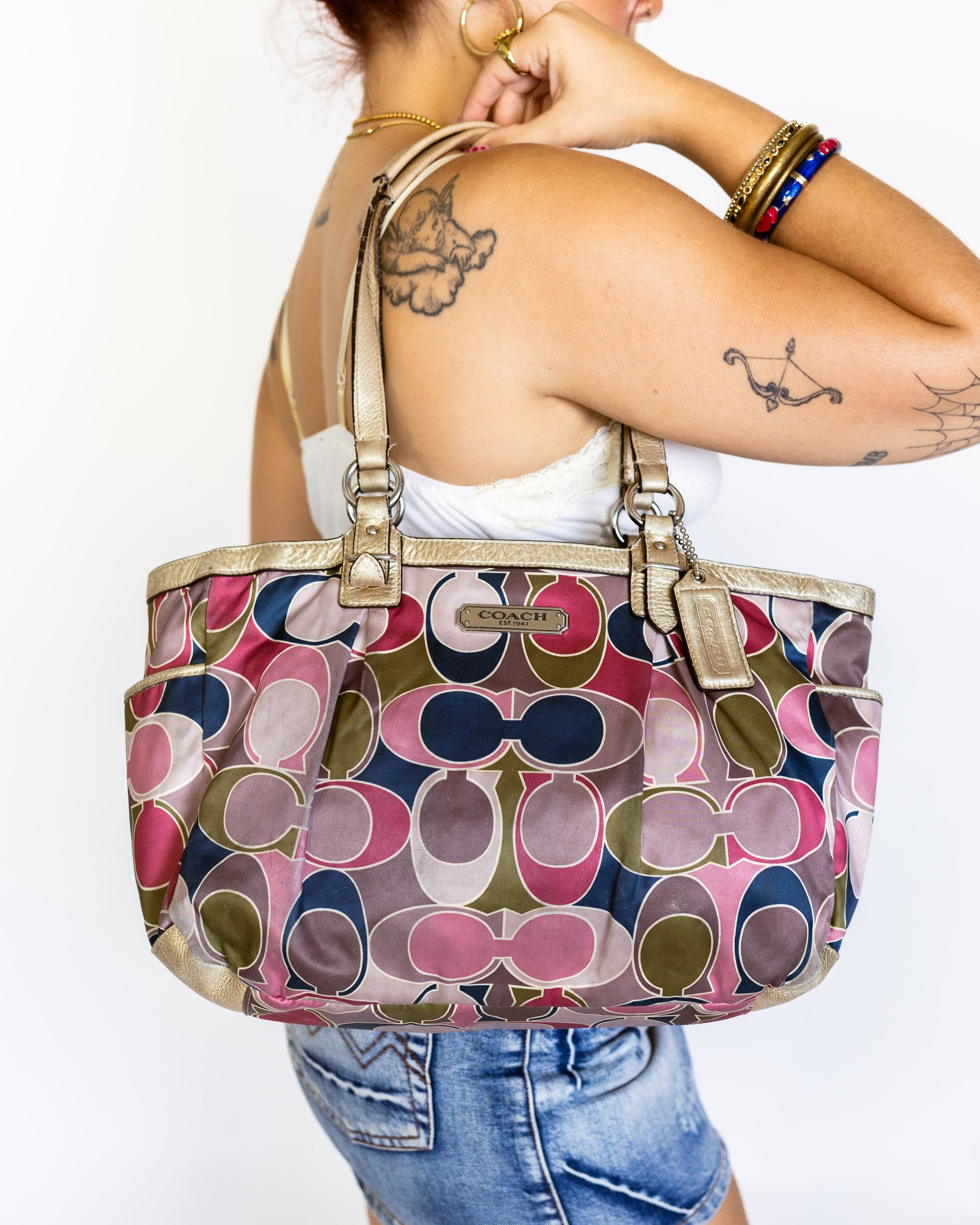 Playful, punchy, and practical — this Coach Gallery Tote is a rare multicolour signature satin style, featuring oversized “C” logos in pink, olive, navy, and plum. Trimmed with metallic gold leather and finished with dual handles, this spacious tote is perfect for everyday carry while still making a statement. A quintessential early-2000s Coach moment.