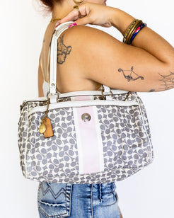 Exterior: Grey jacquard “C” signature canvas with blush pink stripe and white leather trim; front button accent with Coach emblem; detachable Coach hangtag with brass medallion
