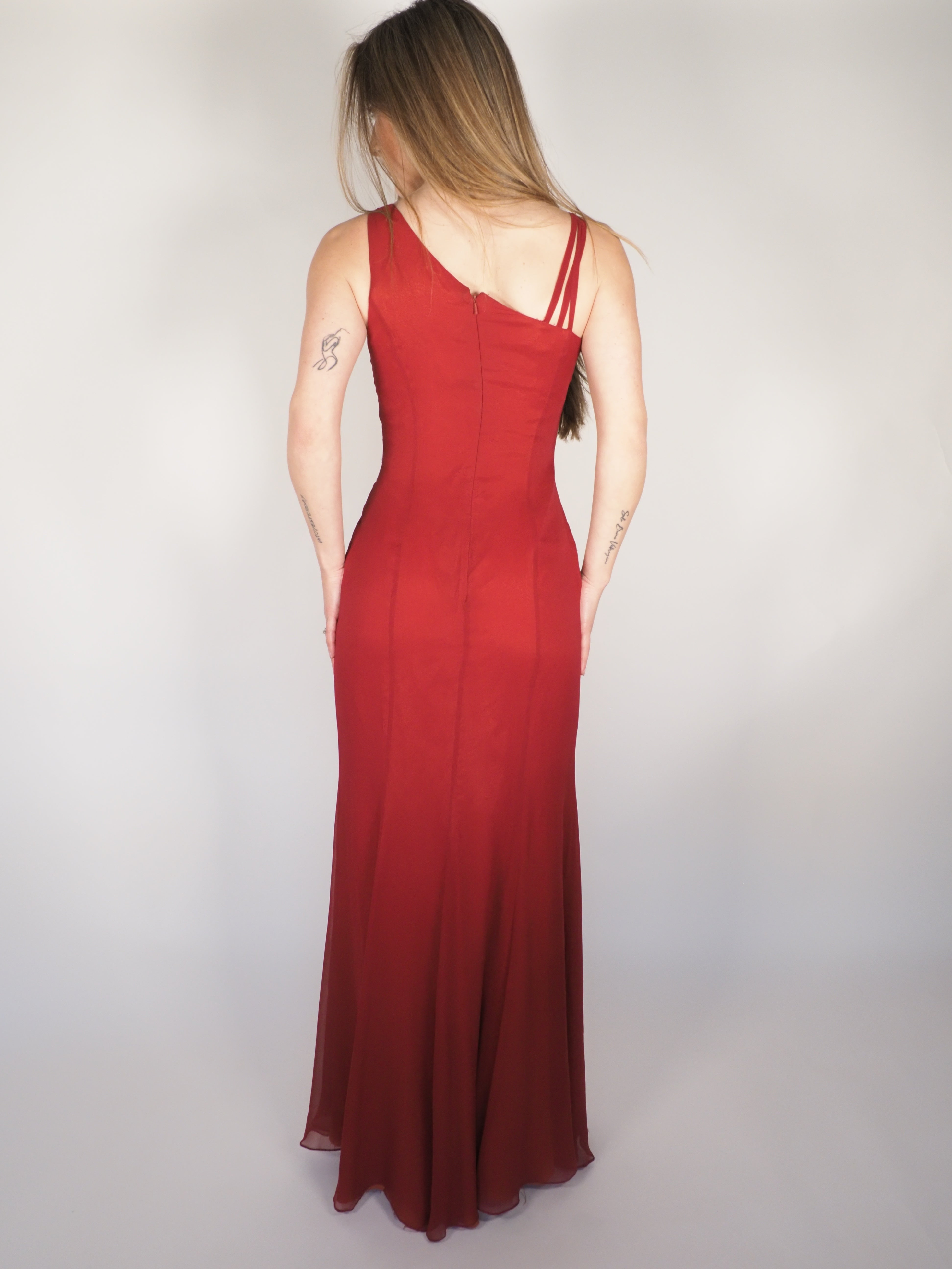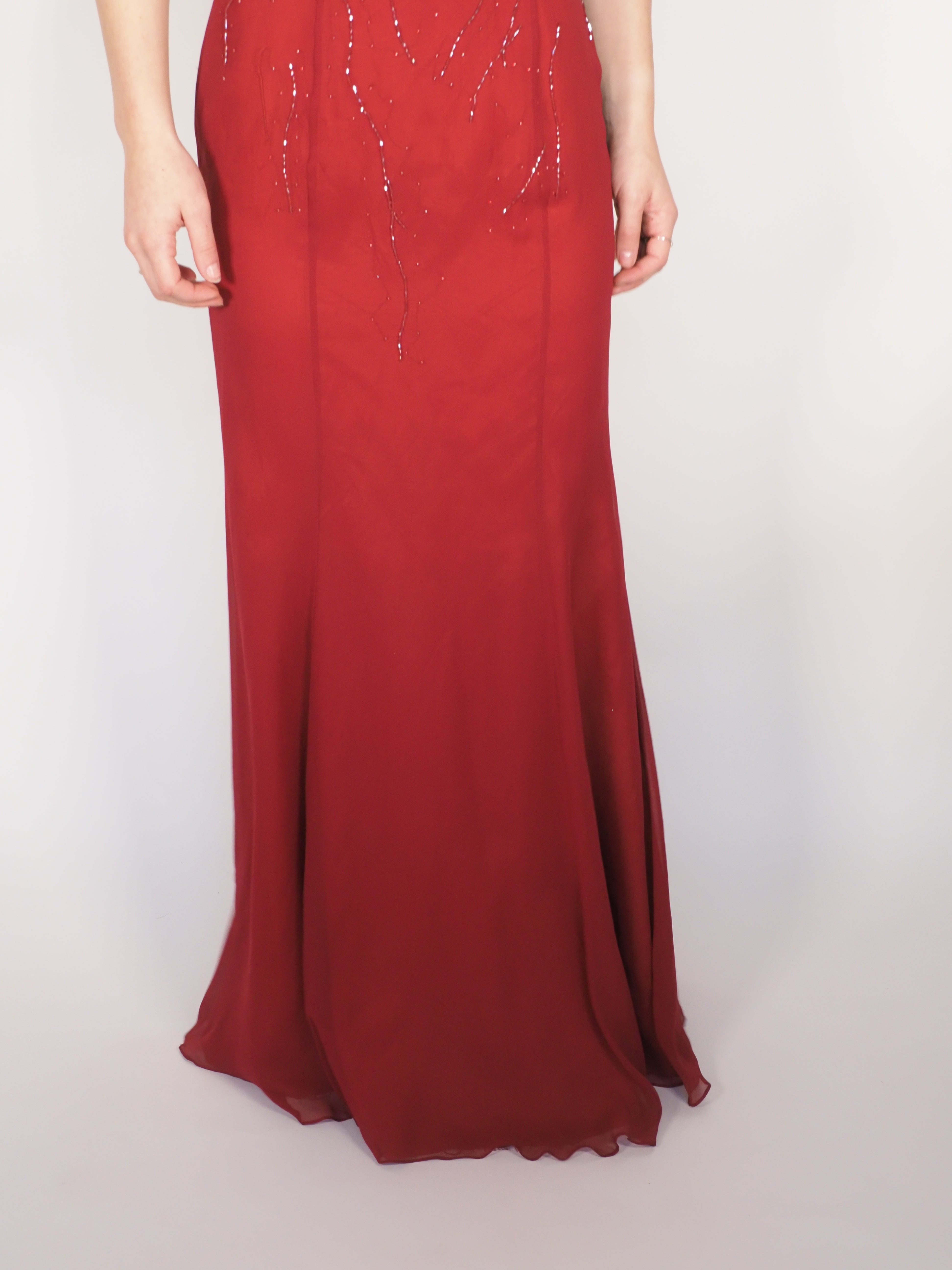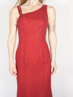 A striking crimson one-shoulder evening gown finished with delicate beaded detailing that catches the light beautifully. Designed with a sleek, floor-length silhouette, this piece is perfect for formal events, special occasions, or whenever you want an elegant vintage statement with minimal effort.