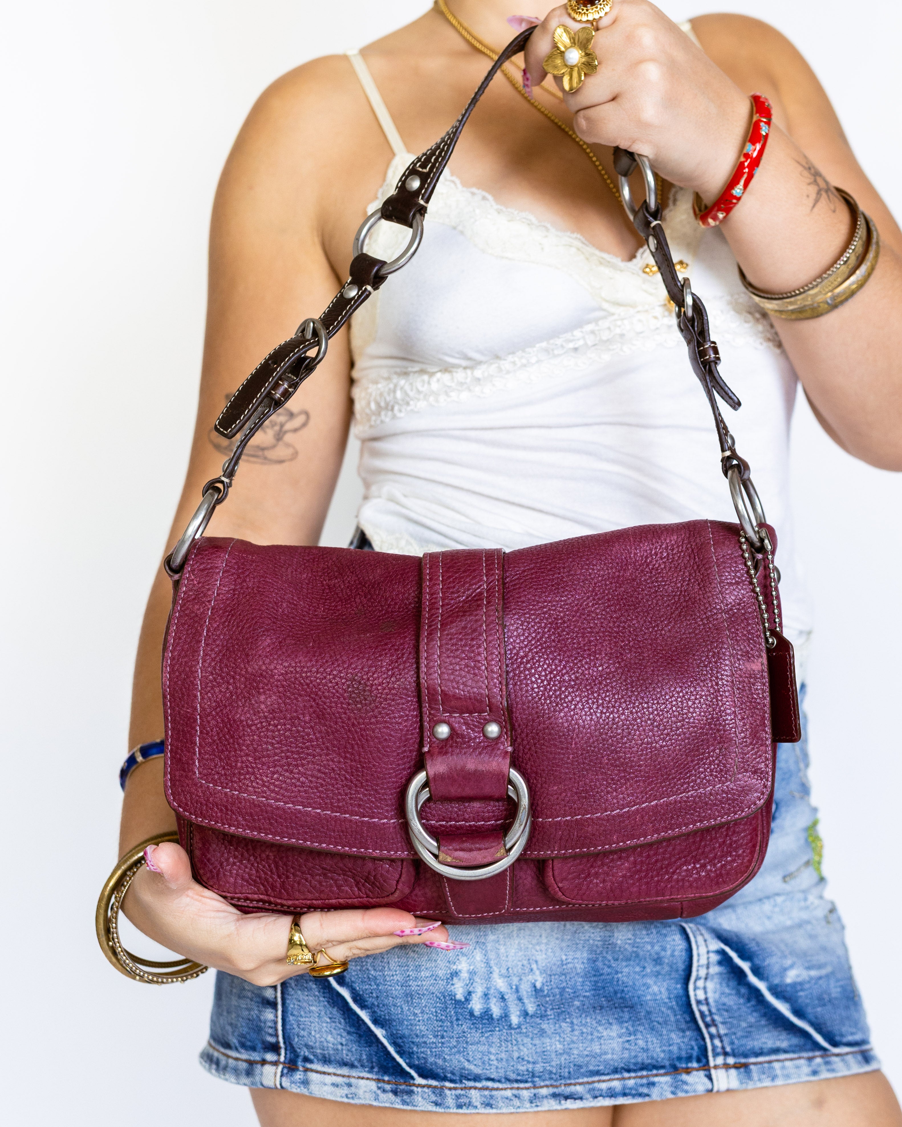 Part of the Coach Bleecker collection, this shoulder bag was built to be a refined, city-chic staple with just the right amount of edge. The pebbled leather and chunky silver ring give it that 2000s utility feel, while the wine hue adds a touch of luxury. It’s giving “cool girl in a blazer” vibes – classic but never boring.