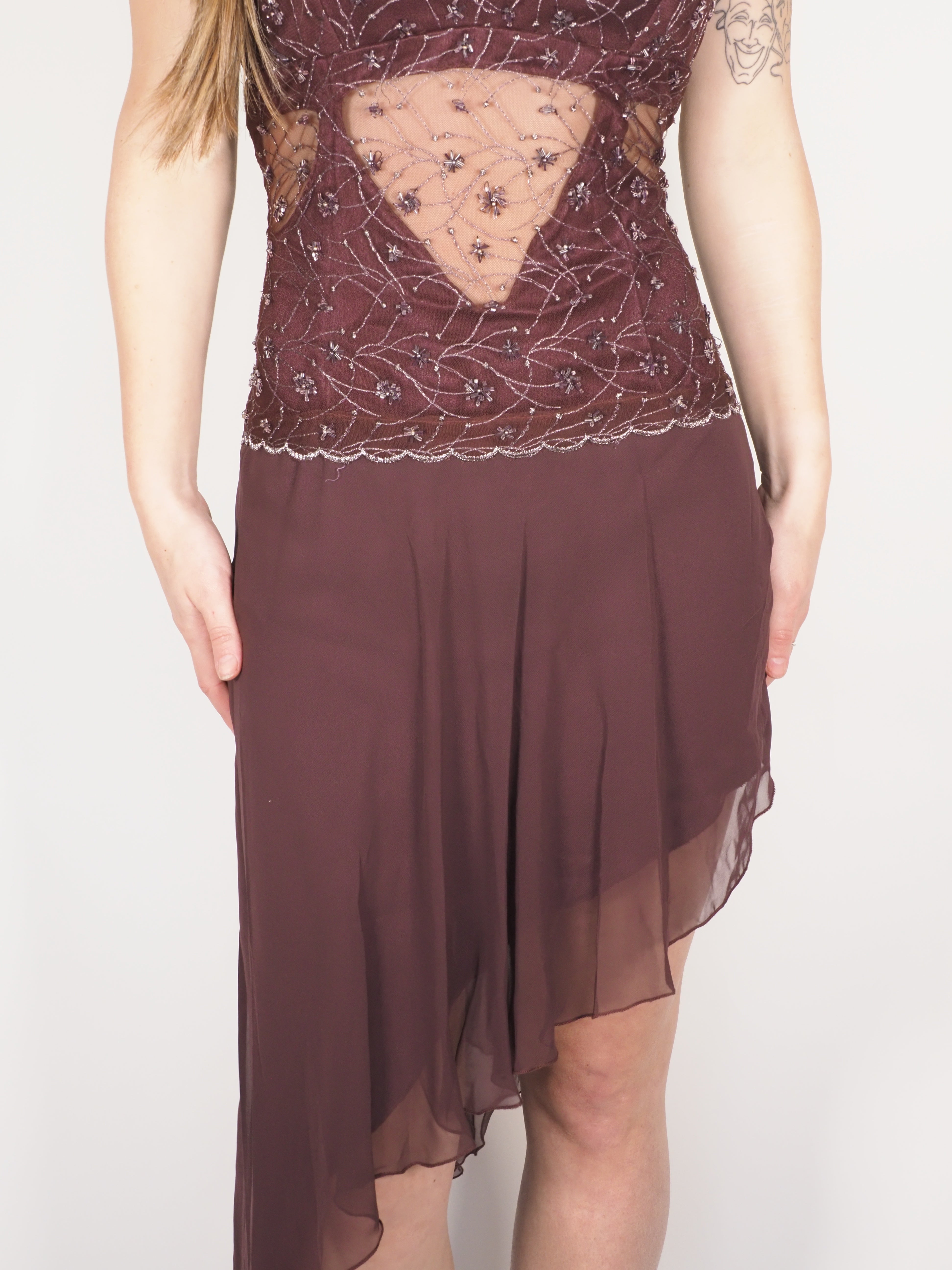 A deep purple halter dress with a sheer finish and delicate beaded lace panels through the bodice, giving it an elegant yet distinctly Y2K feel. The halter neckline highlights the shoulders, while the asymmetrical hem adds soft movement, making it perfect for evenings out or styled down with boots for a more relaxed vintage look.