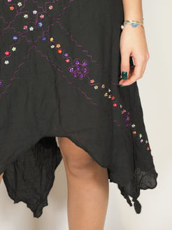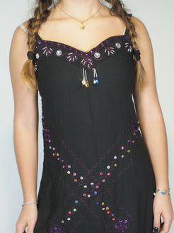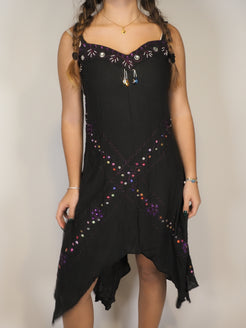 A flowing black dress with a handkerchief hem, finished with delicate bead and embellishment detailing that catches the light beautifully. An easy statement piece with subtle Y2K vibes, perfect for evenings, festivals, or dressed-up casual moments.