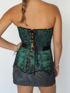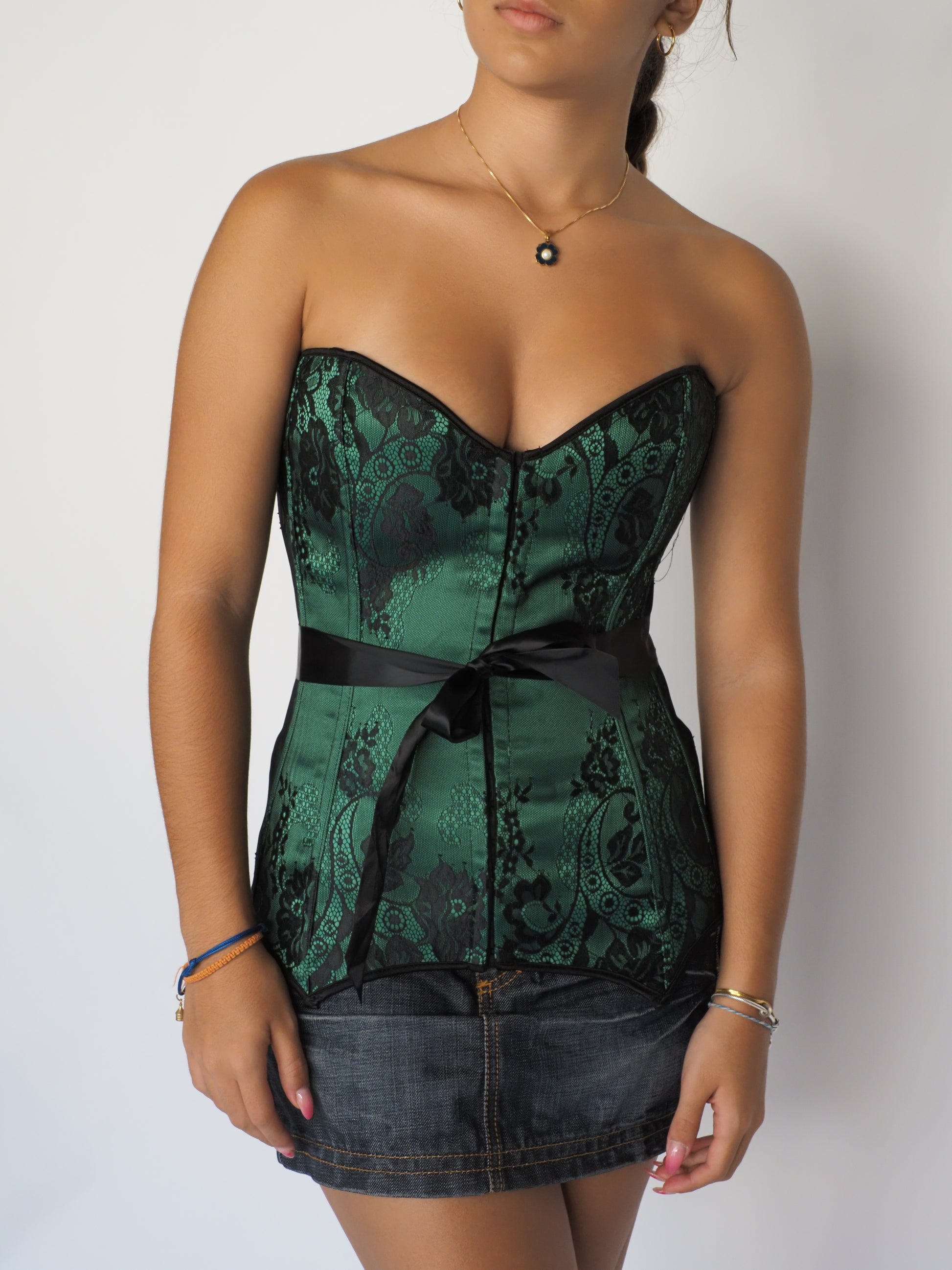 Emerald Green Brocade Strapless Corset Top with Black Lace Overlay & Satin Waist Tie