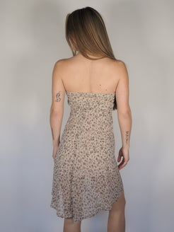 A soft strapless mini dress with a delicate floral print and handkerchief hem, giving it a light, flowy feel. Easy to wear and perfect for warm days or layering with a cardigan.