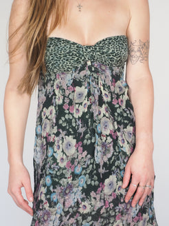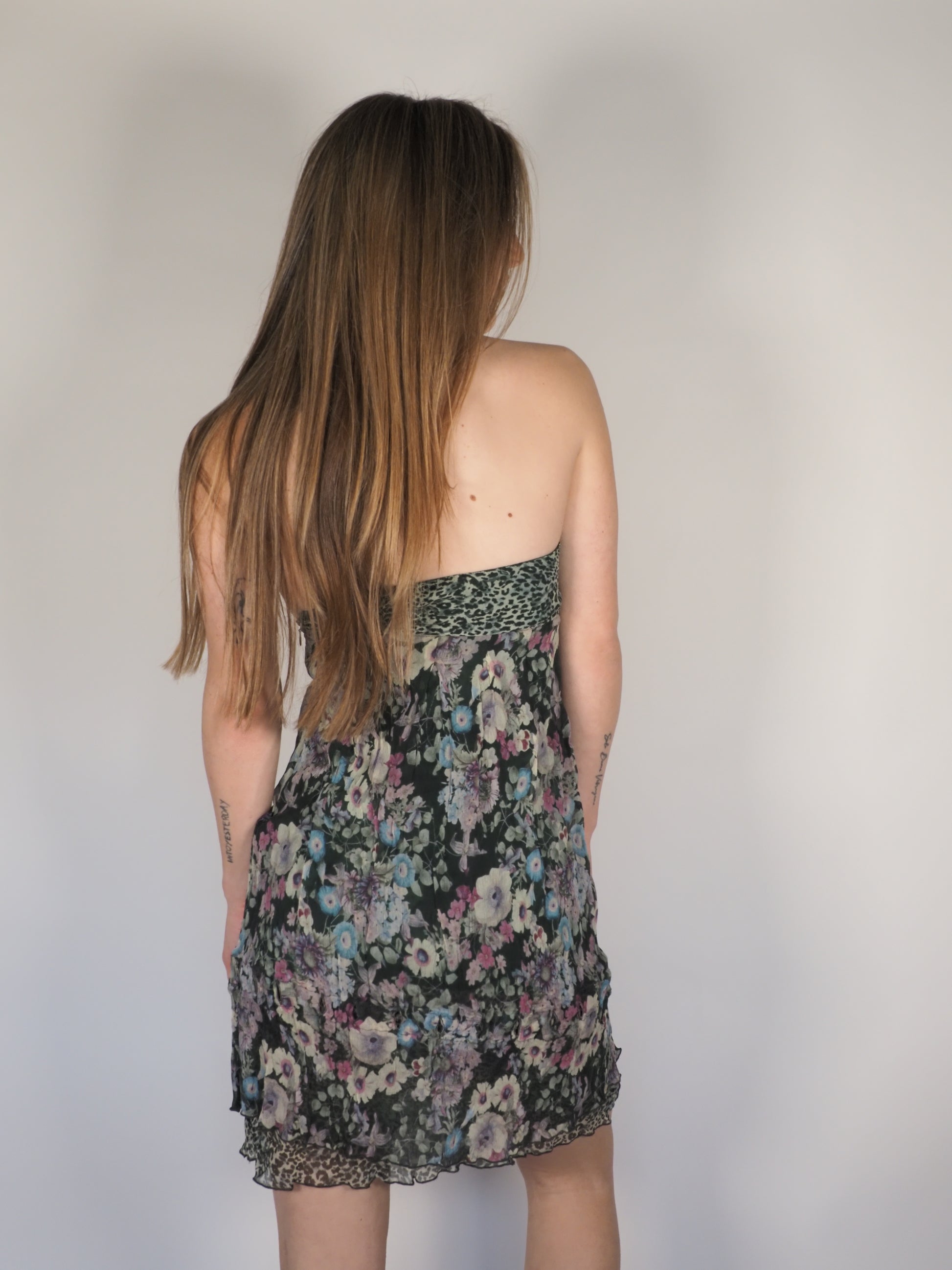 Strapless Y2K Italian vintage dress featuring a floral print with subtle leopard detailing, designed to flatter the silhouette while giving effortless early-2000s It-girl energy.