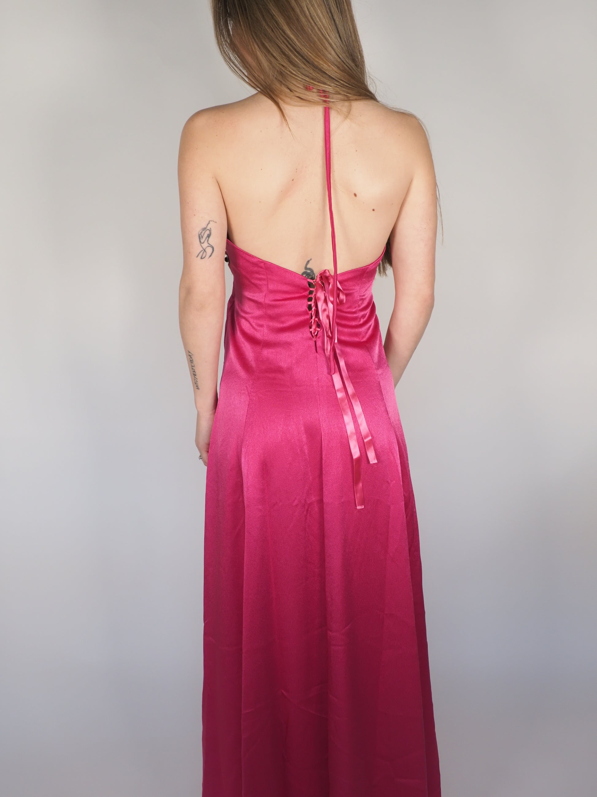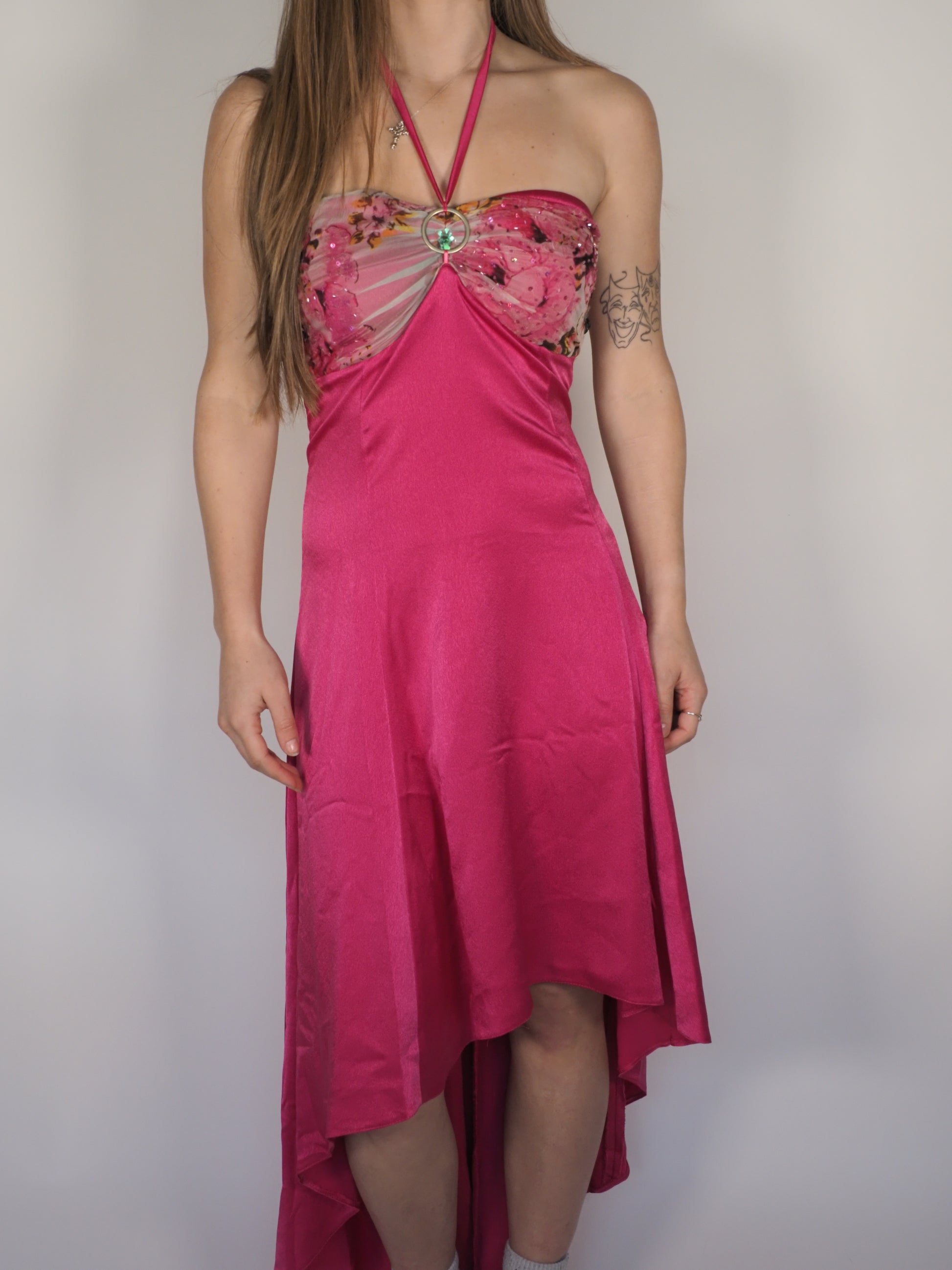 A hot pink halter dress featuring a statement ring detail at the bust and soft floral accents, giving it a bold Y2K-inspired look. The hi-low hem adds movement and flow, making it an easy statement piece for summer nights, parties, or dressed down with flats for a more casual vintage feel.