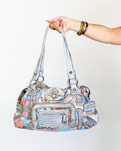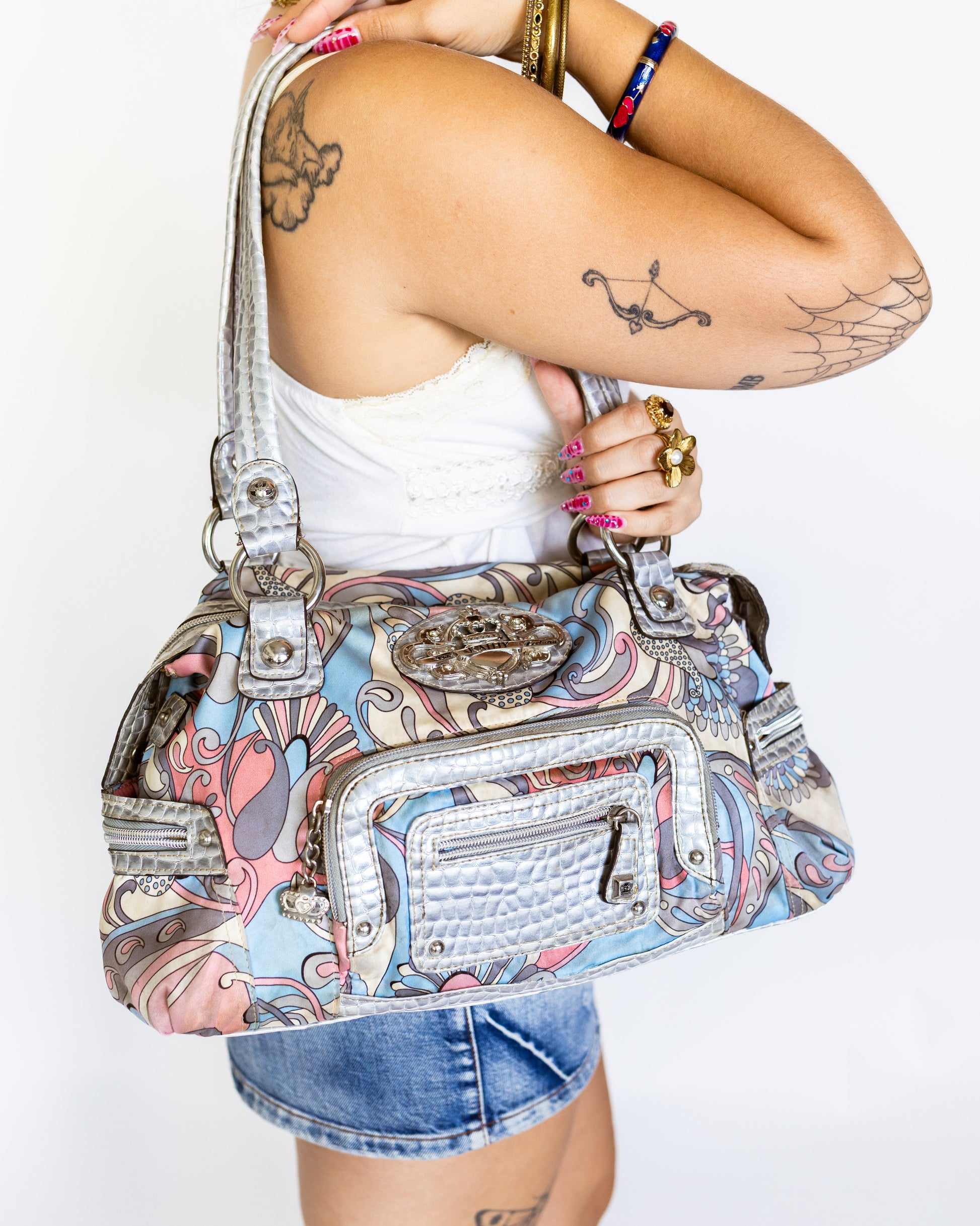 This bag is a perfect throwback to the maximalist Y2K era – think 2007 paparazzi shots of girls leaving Kitson in LA. Kathy Van Zeeland’s signature combo of playful prints, metallic textures, and bold crown logos makes this a nostalgic statement piece. It screams personality and flair without trying too hard.