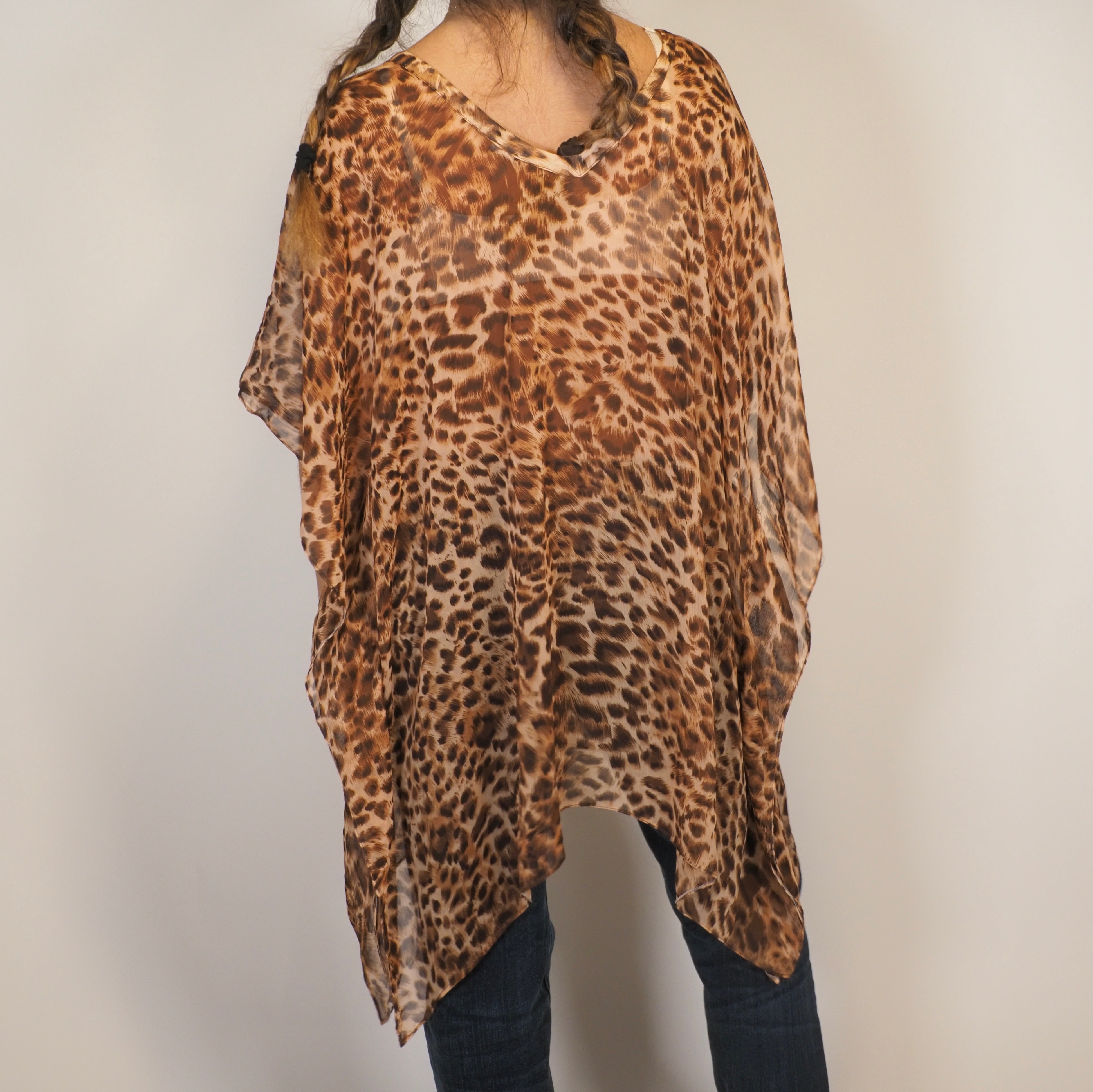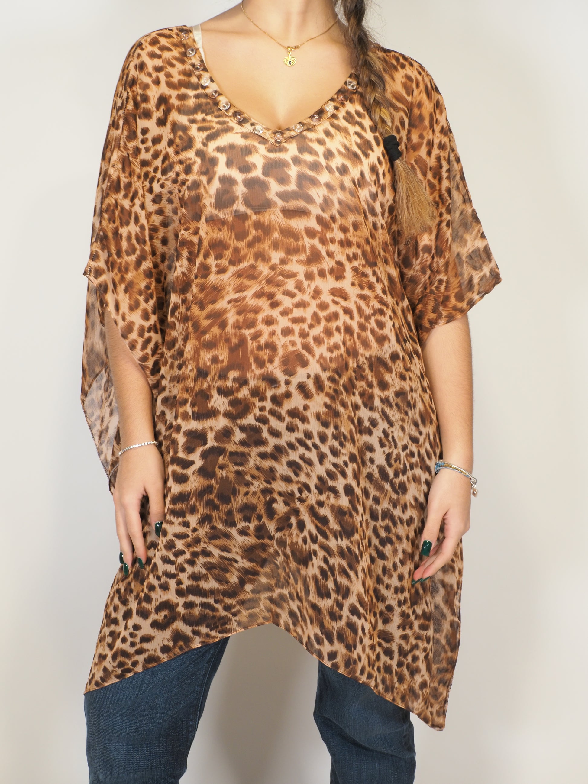 Leopard Print Sheer Kaftan Top with Crystal-Trim V-Neck