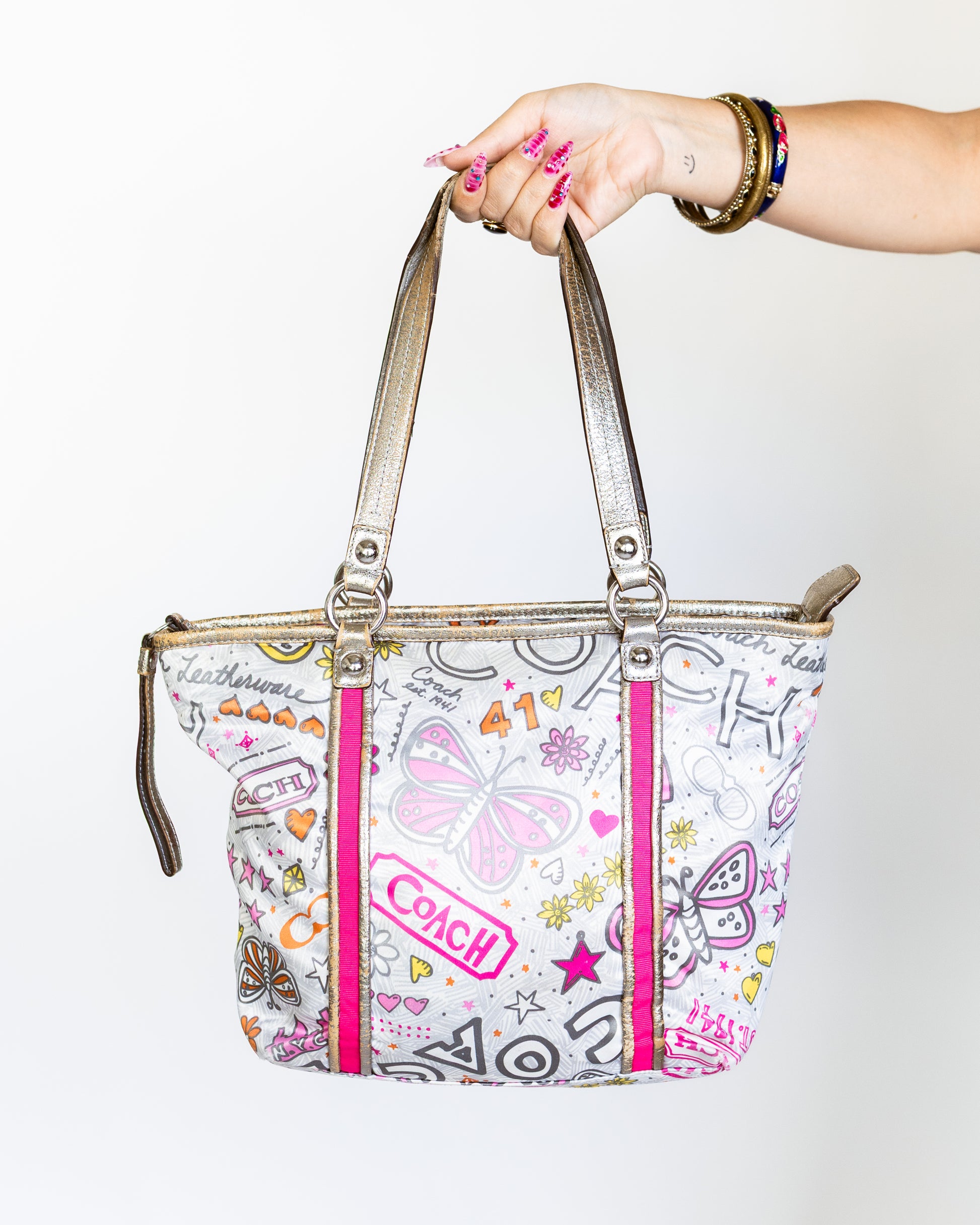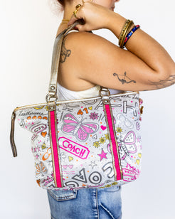 Originally released under the Coach Poppy line, this graffiti-style tote is a Y2K cult favourite — part of the era where Coach leaned all the way into playful, girly branding. With butterflies, stars, hearts, logos, and metallic pink detailing, this bag feels like a teenage diary in handbag form. Rare, instantly recognisable, and a total vibe.