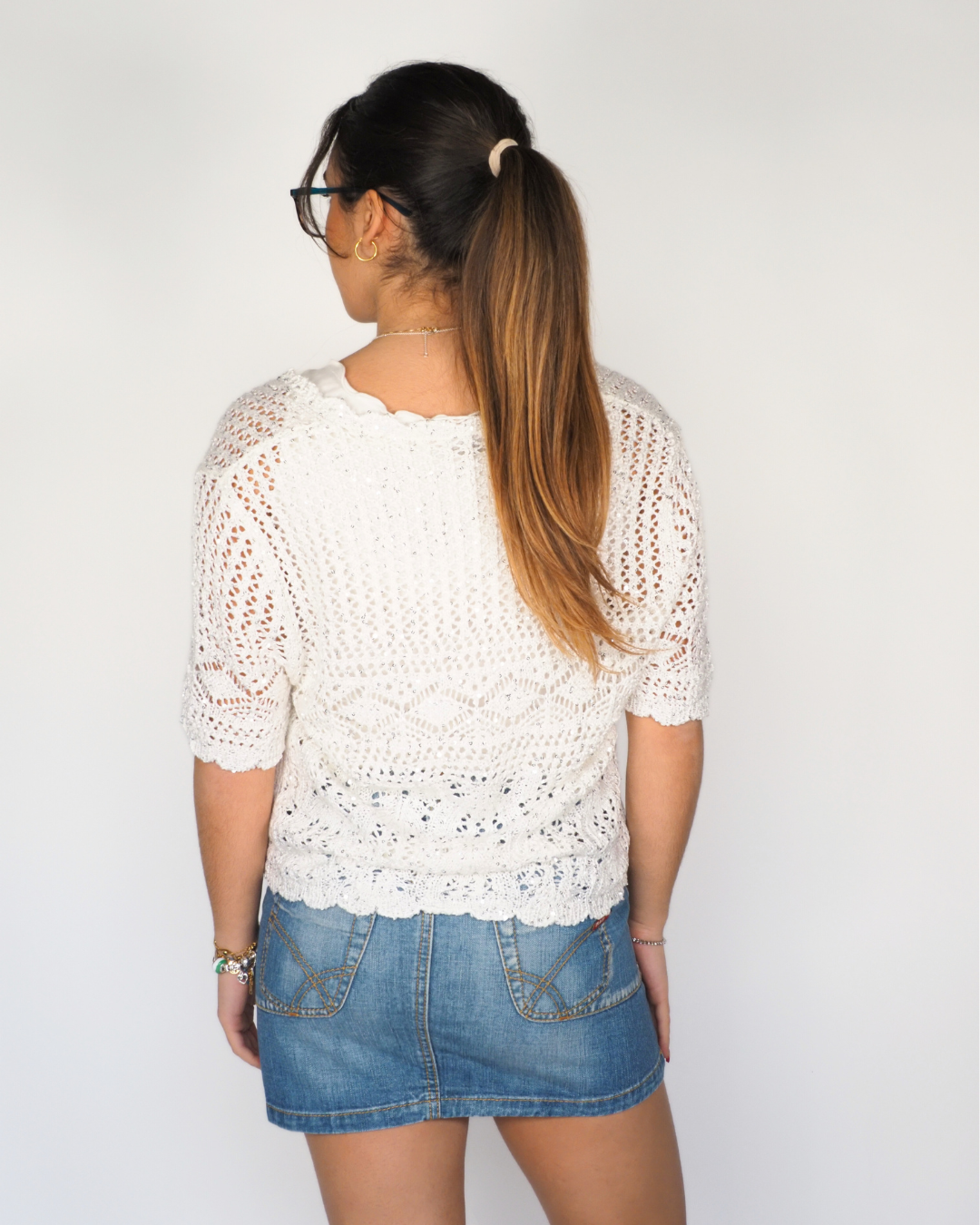 Canda Premium White Sequin Crochet Knit Cardigan