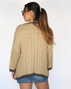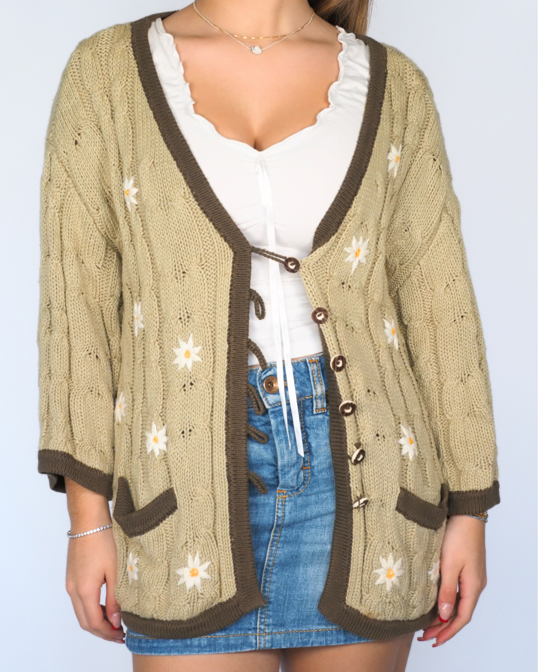 Vintage Daisy Knit Cotton Cardigan in Olive & Brown