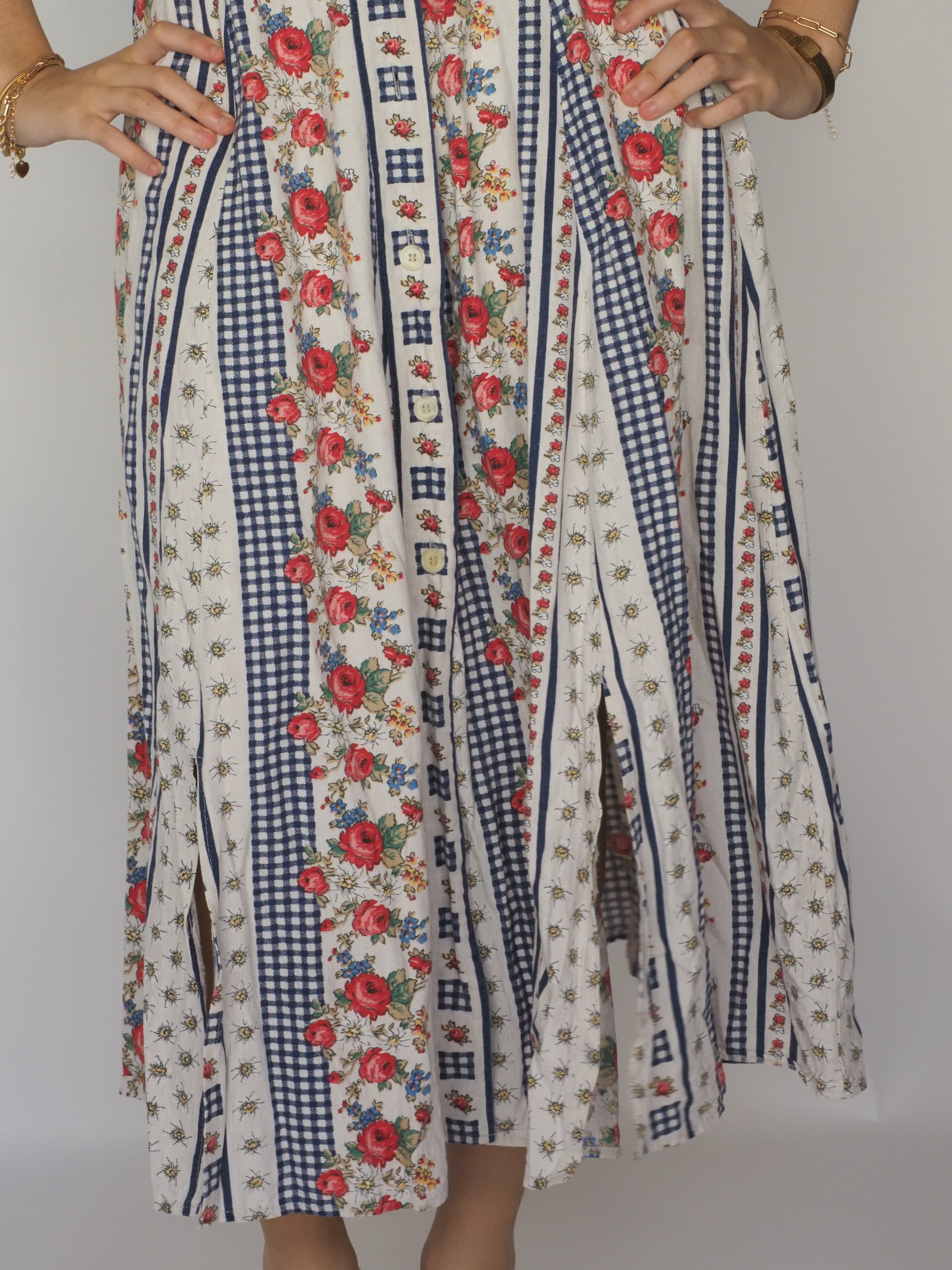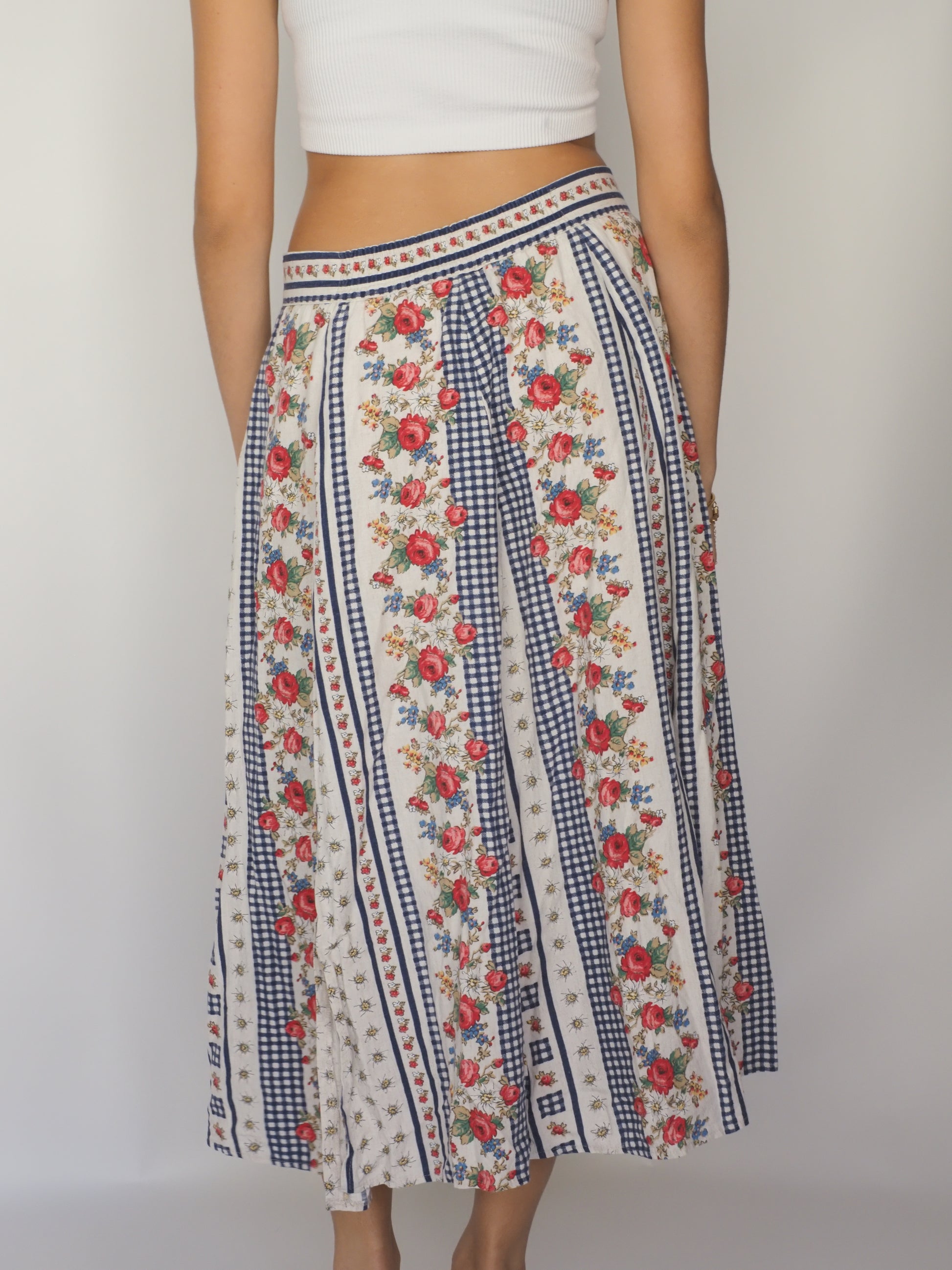 Navy Gingham & Floral Print Midi Skirt with Front Slit