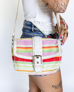 Canvas body with candy pastel stripe print in pink, green, red, orange, and lilac