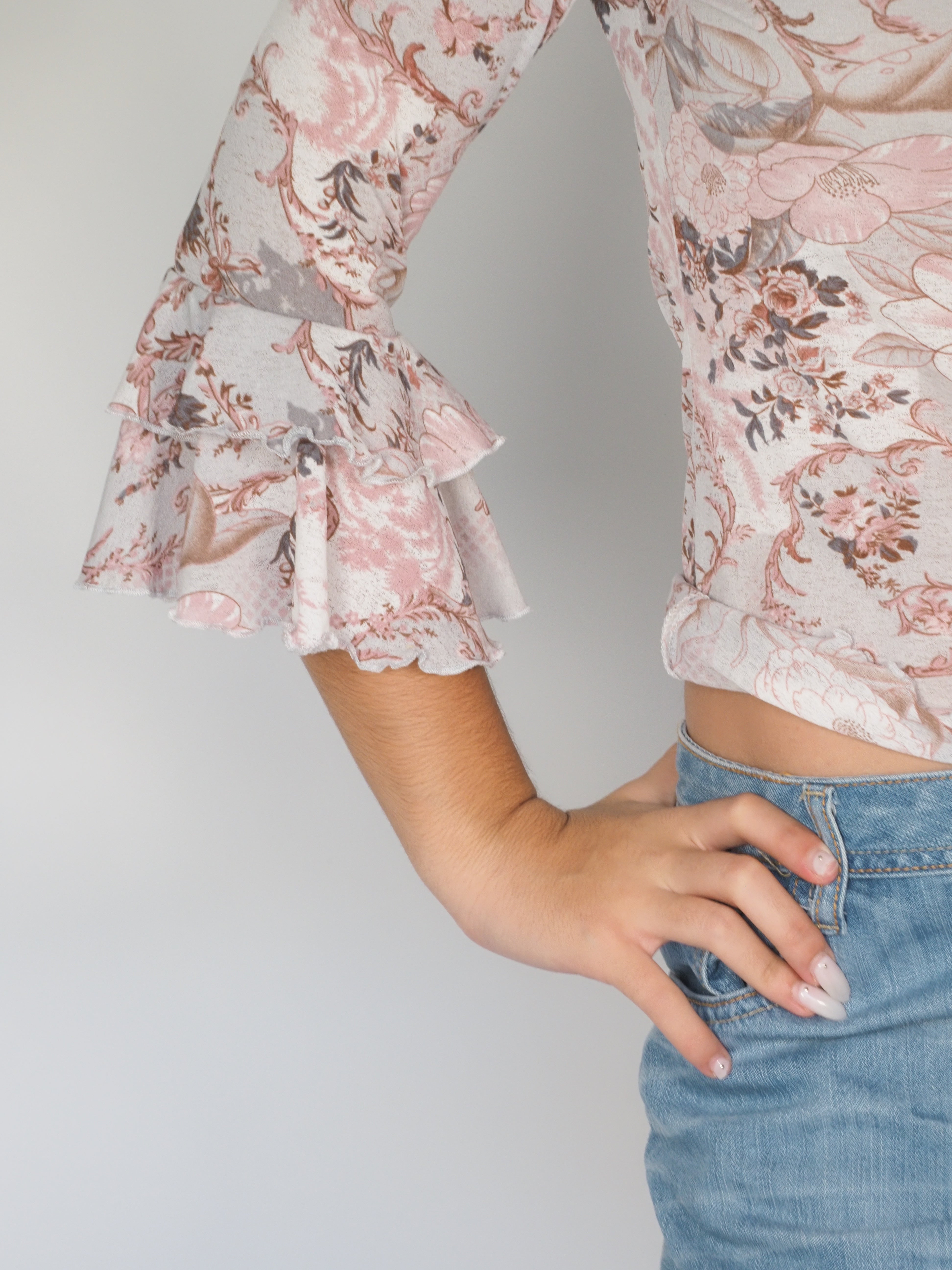 Pink Floral Mesh Bell-Sleeve Top – Raspberry