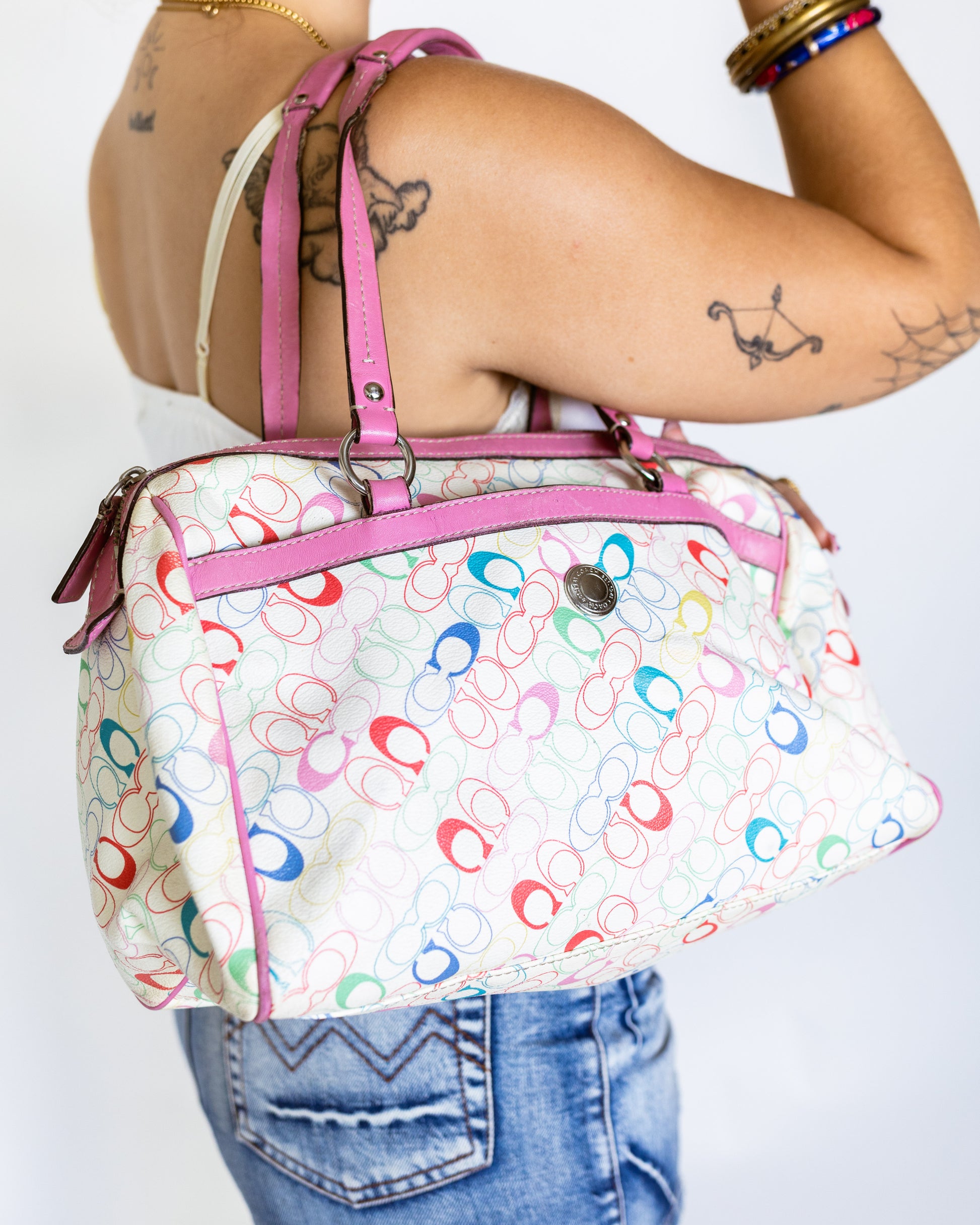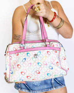 A true Y2K-era gem, this bag was released during the height of Coach’s playful experimental phase. The rainbow monogram makes it feel like a limited-edition candy drop, while the pink leather detailing adds that iconic “Barbie but make it Coach” energy. Think: Paris Hilton meets Bratz.