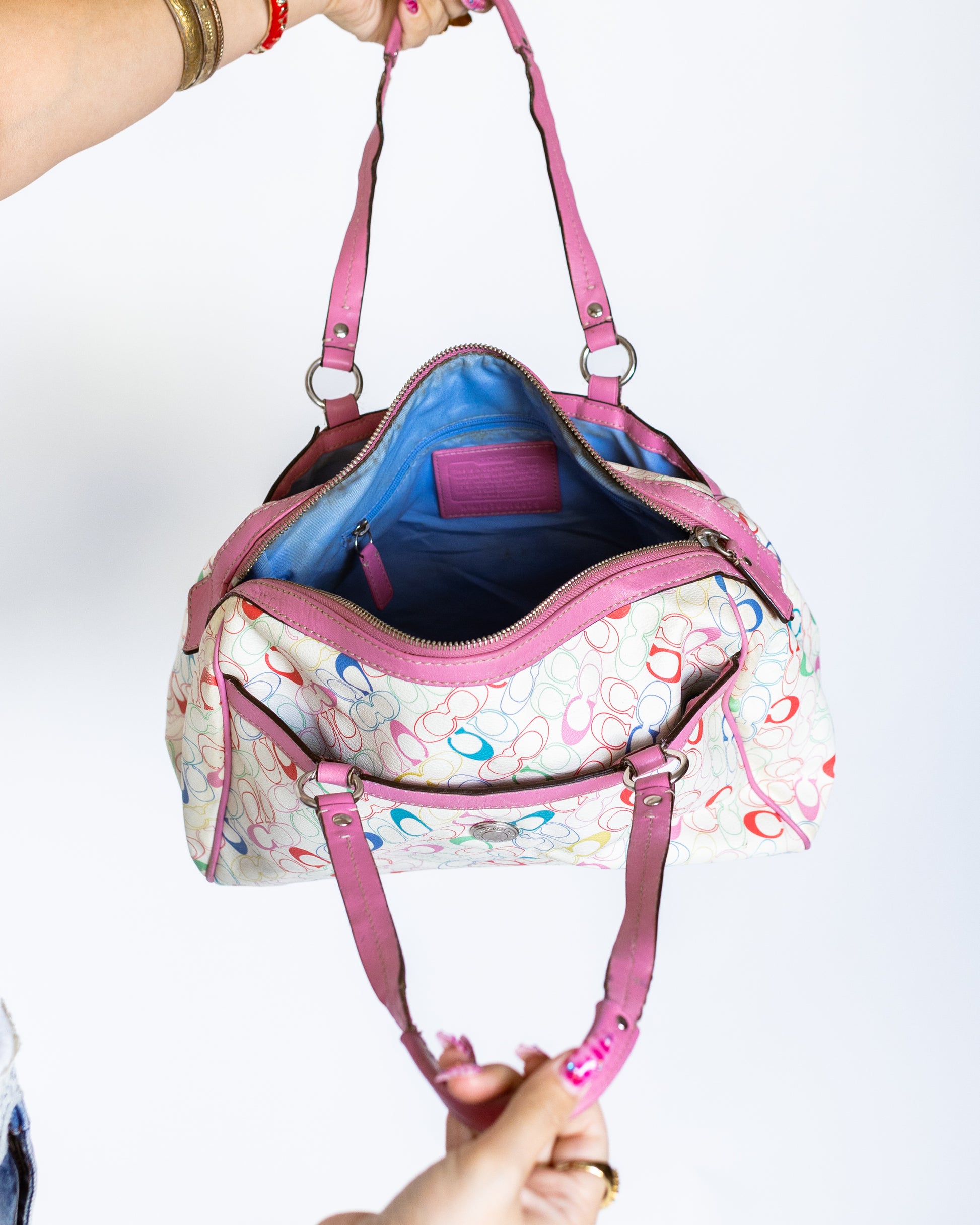 Interior lined in sky blue fabric with a pink Coach creed patch