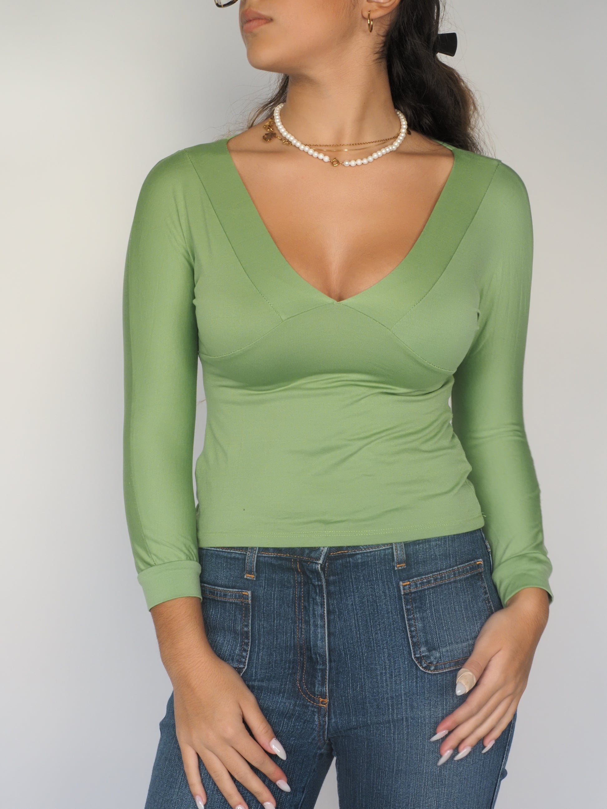 Sage Green Deep V Long Sleeve Top – Piccole Donne