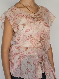 Sheer Paisley Flutter-Sleeve Blouse in Blush & Bronze