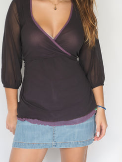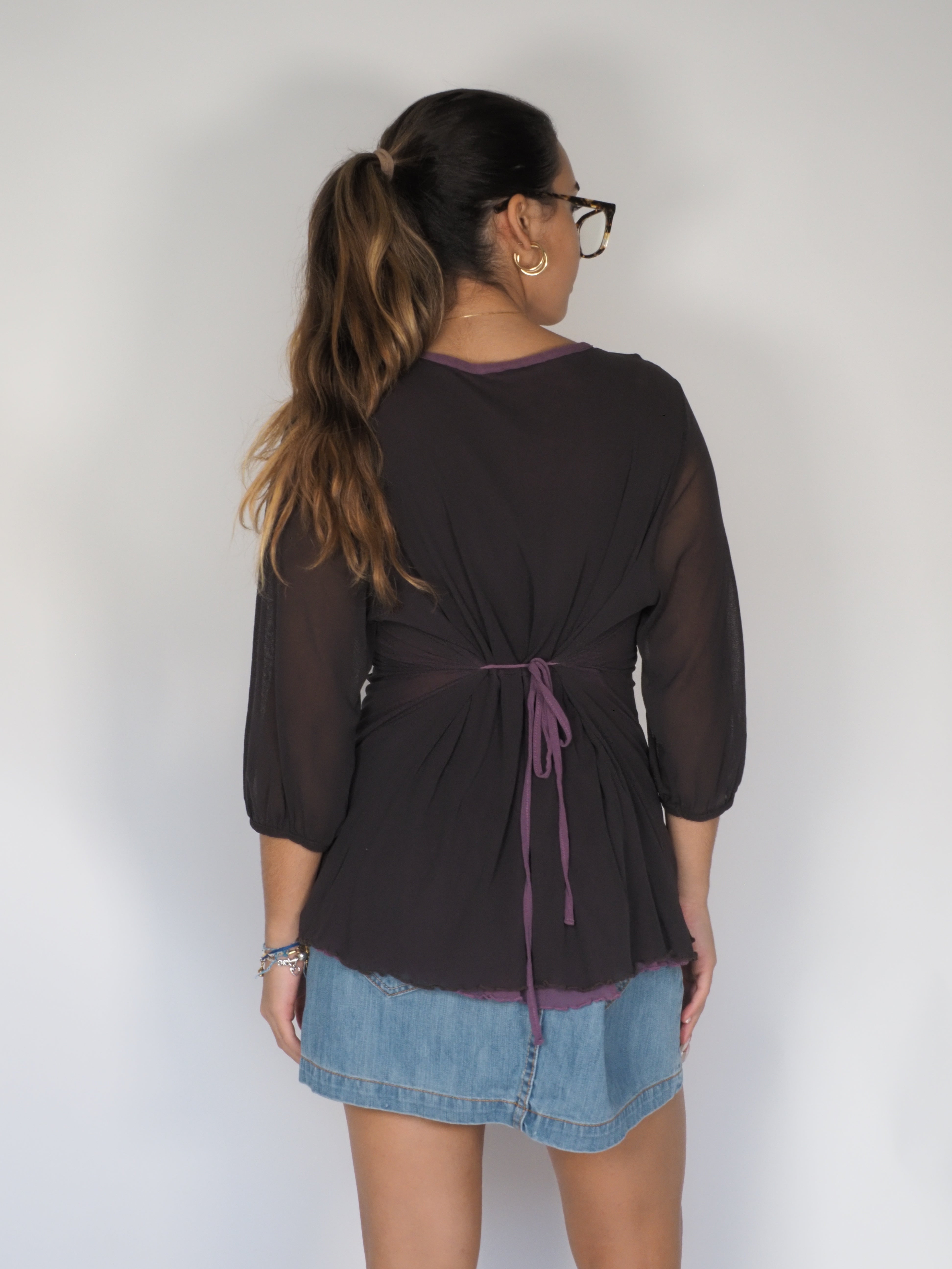 Sheer Plum Wrap Blouse with Lettuce Hem
