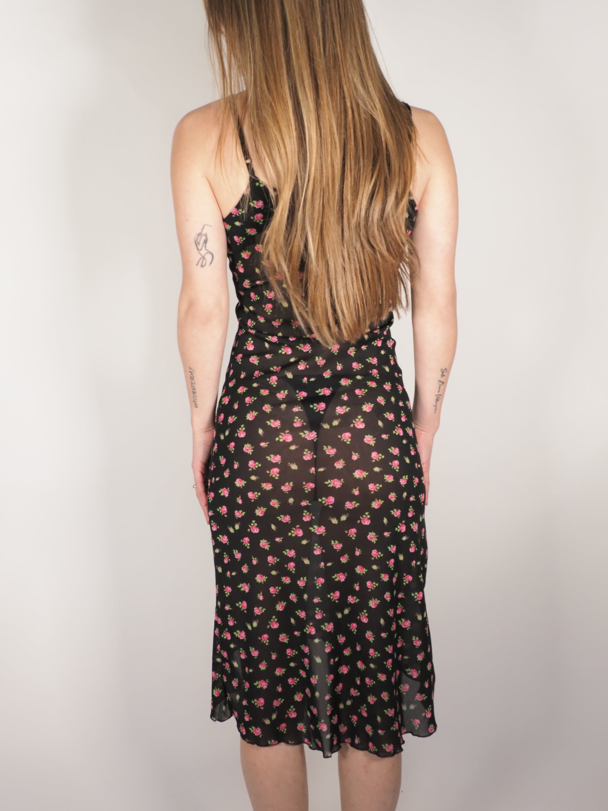 This sheer rose print slip dress features a delicate all-over floral pattern with a soft, lightweight feel that drapes beautifully on the body. Designed with thin straps and a flattering straight silhouette, it’s perfect layered over a slip or styled on its own for an effortless Y2K-inspired look that works day to night.