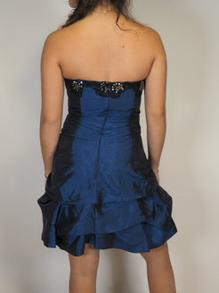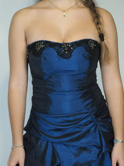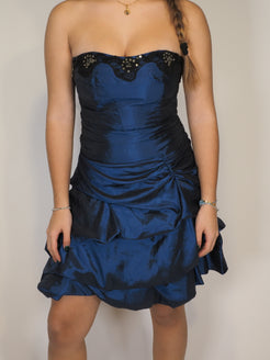 A striking strapless blue satin corset dress with a sculpted bodice and soft draping that hugs the waist beautifully. Finished with subtle detailing for an elegant Y2K evening look that works perfectly for nights out, events, or special occasions.