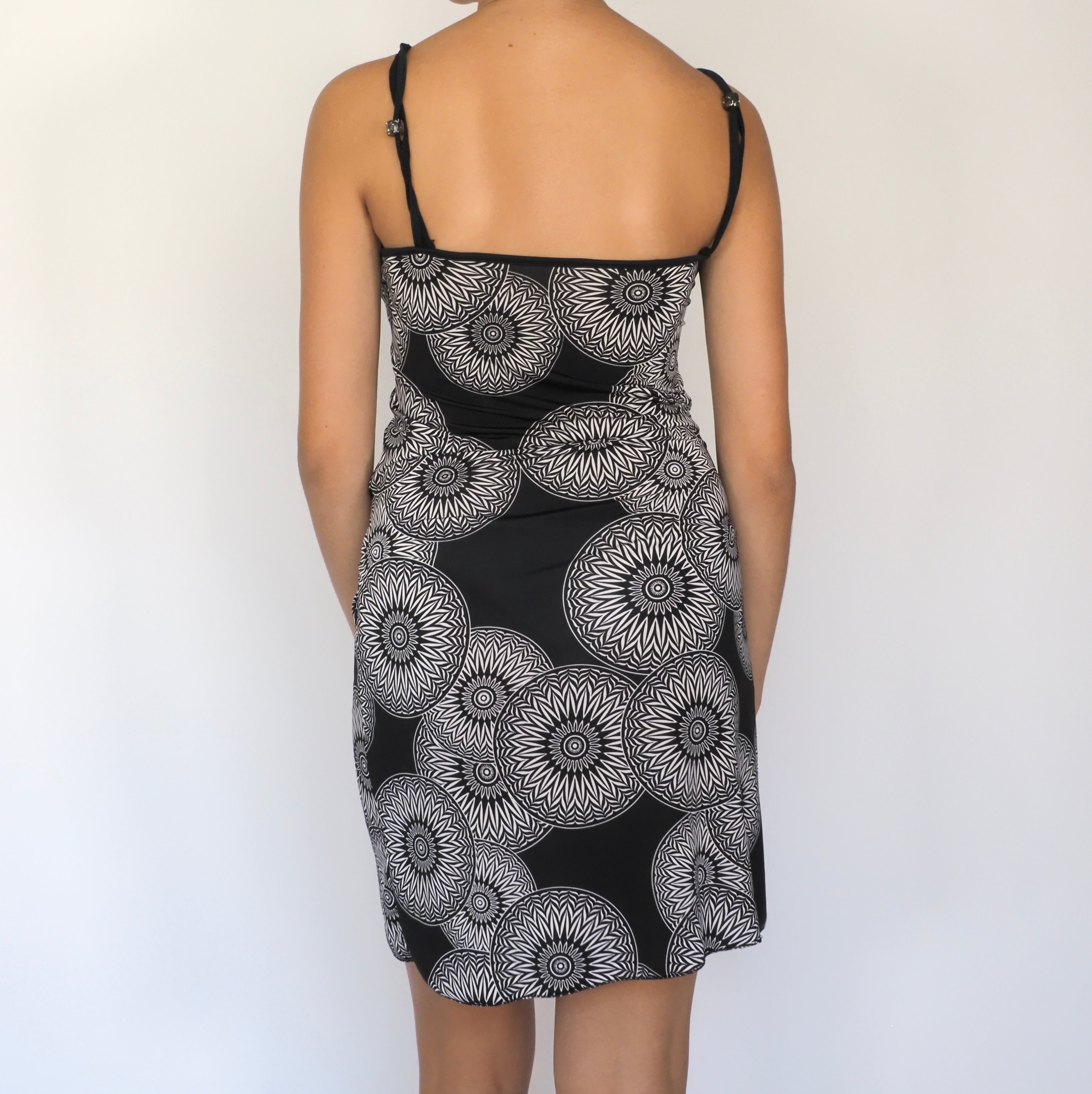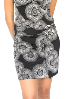 Vintage Y2K Black & White Graphic Print Mini Dress with Buckle Detail