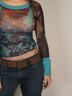 Y2K Abstract Mesh Long-Sleeve Top with Contrast Cuffs