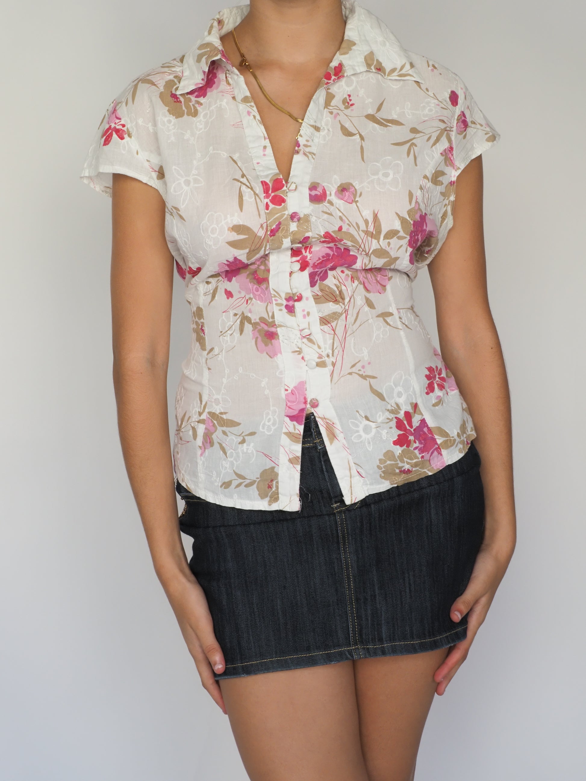 Zoteno Sheer Floral Button-Up Blouse – White with Pink & Beige Flowers